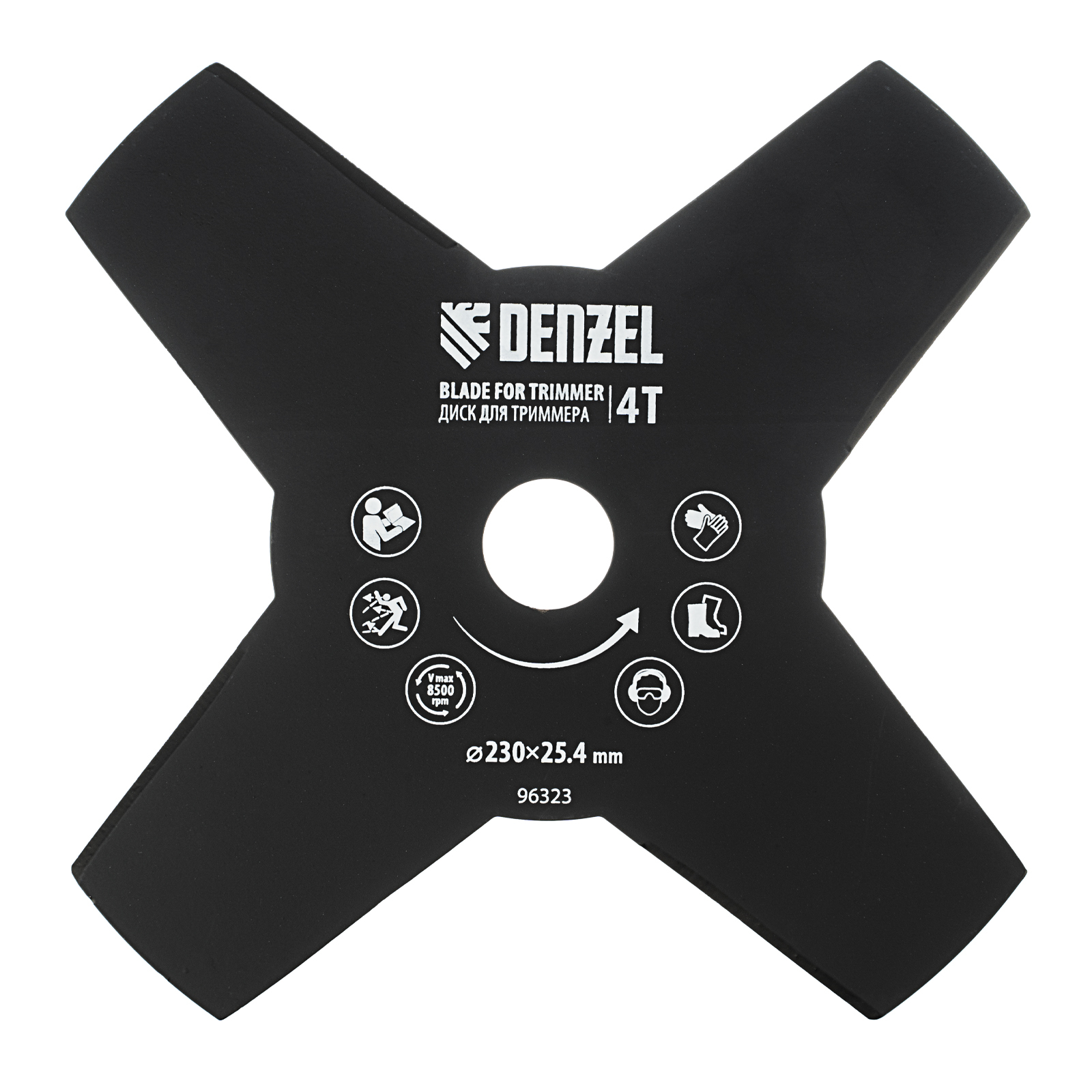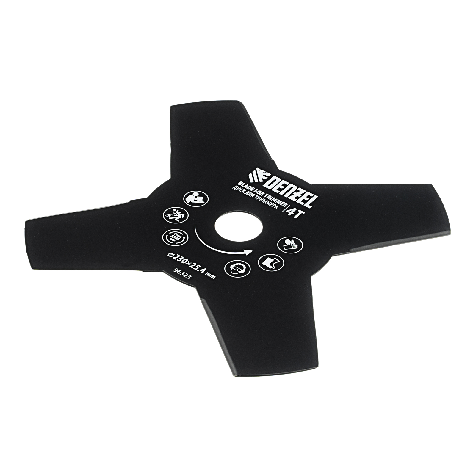 Диск для триммера Denzel 96323 размером 230 х 25,4 мм, толщиной 1,6 мм, с 4 лезвиями, предназначен для скашивания травы различных типов, в том числе с жесткими стеблями (полыни, крапивы, лебеды). Рекомендован к использованию со всеми типами бензиновых триммеров, а также с электрическими триммерами мощностью не менее 1,0 кВт, например Denzel 96611 и 96612.