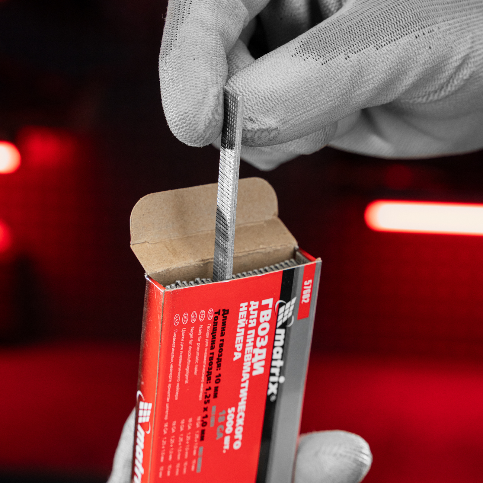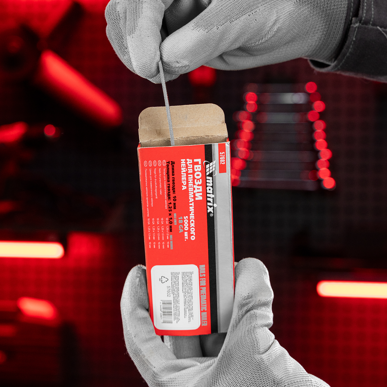 Гвозди Matrix 18GA 57602, 5000 шт. в упаковке, предназначены для установки в магазин пневматического нейлера, работающего с крепежами длиной 10, шириной 1,25 и толщиной 1 мм. Они служат для обивки мебели, закрепления плинтусов, молдинга и настила, монтажа теплиц.