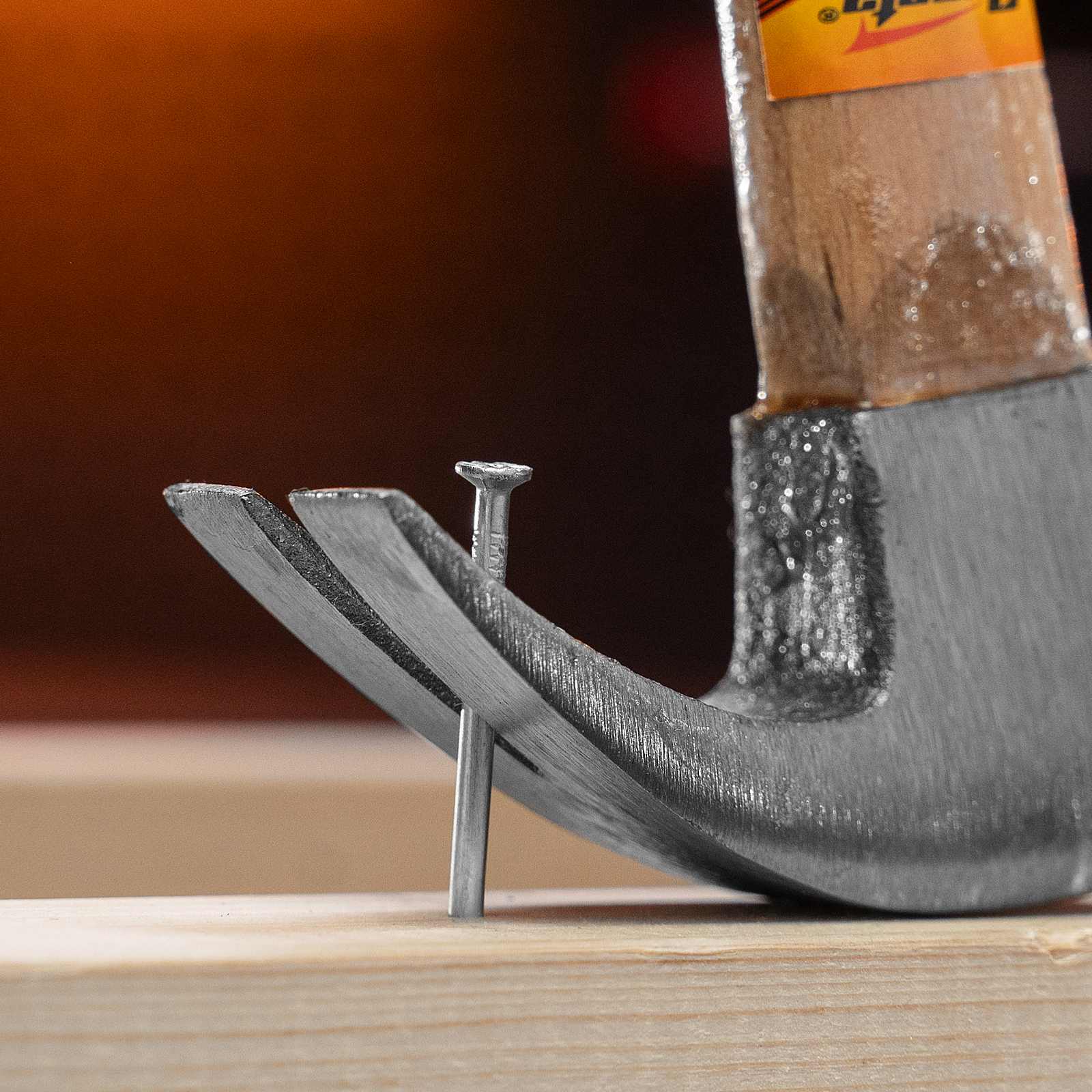 - Продуманная конструкция — увеличенная «юбка» в месте входа рукояти в головку защищает рукоятку от повреждений в случае промаха по гвоздю.