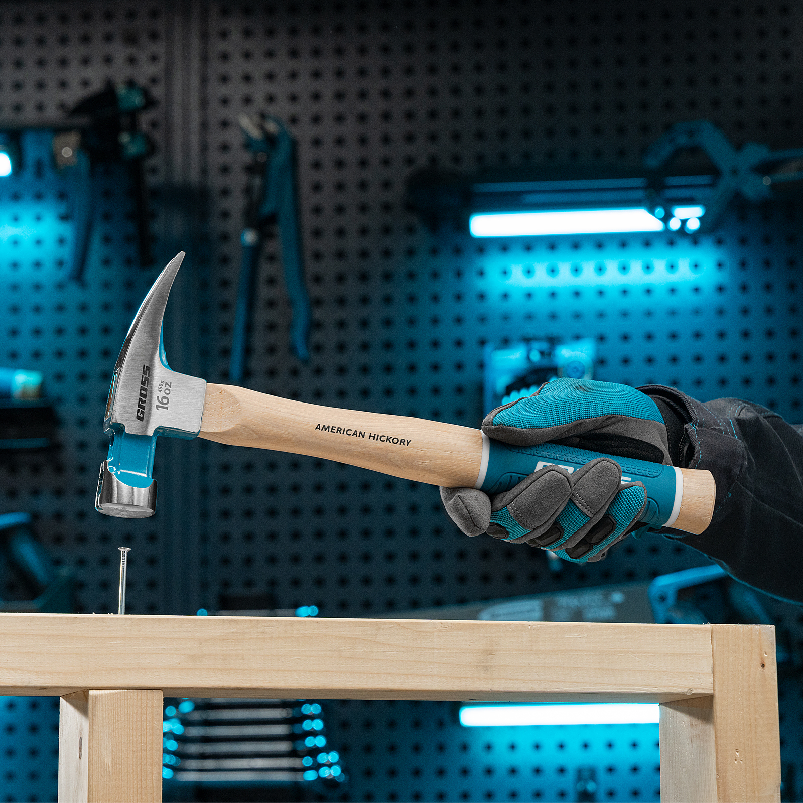 Молоток-гвоздодер Gross American Hickory 10418 длиной 355 мм, с рабочей головой весом 450 г, с магнитом и обрезиненной рукояткой, предназначен для забивания крепежных элементов и извлечения неудачно вбитых гвоздей. Носок, загнутый под углом 75°, позволяет легко вытянуть гвоздь. Благодаря двум прорезям — мини и стандартной — молоток подходит для работы с крепежом разного размера. Края гвоздодера можно затачивать для лучшего захвата шляпки гвоздя. Инструмент будет полезен во время отделочных работ, при сборке мебели, пригодится также дома, на даче или в гараже.