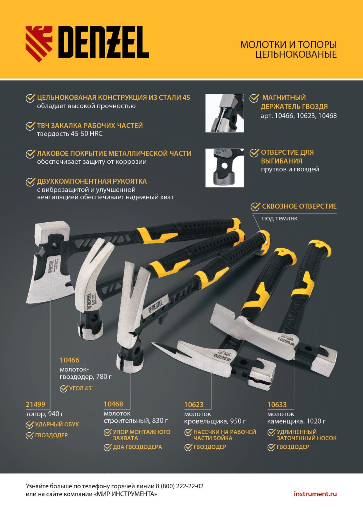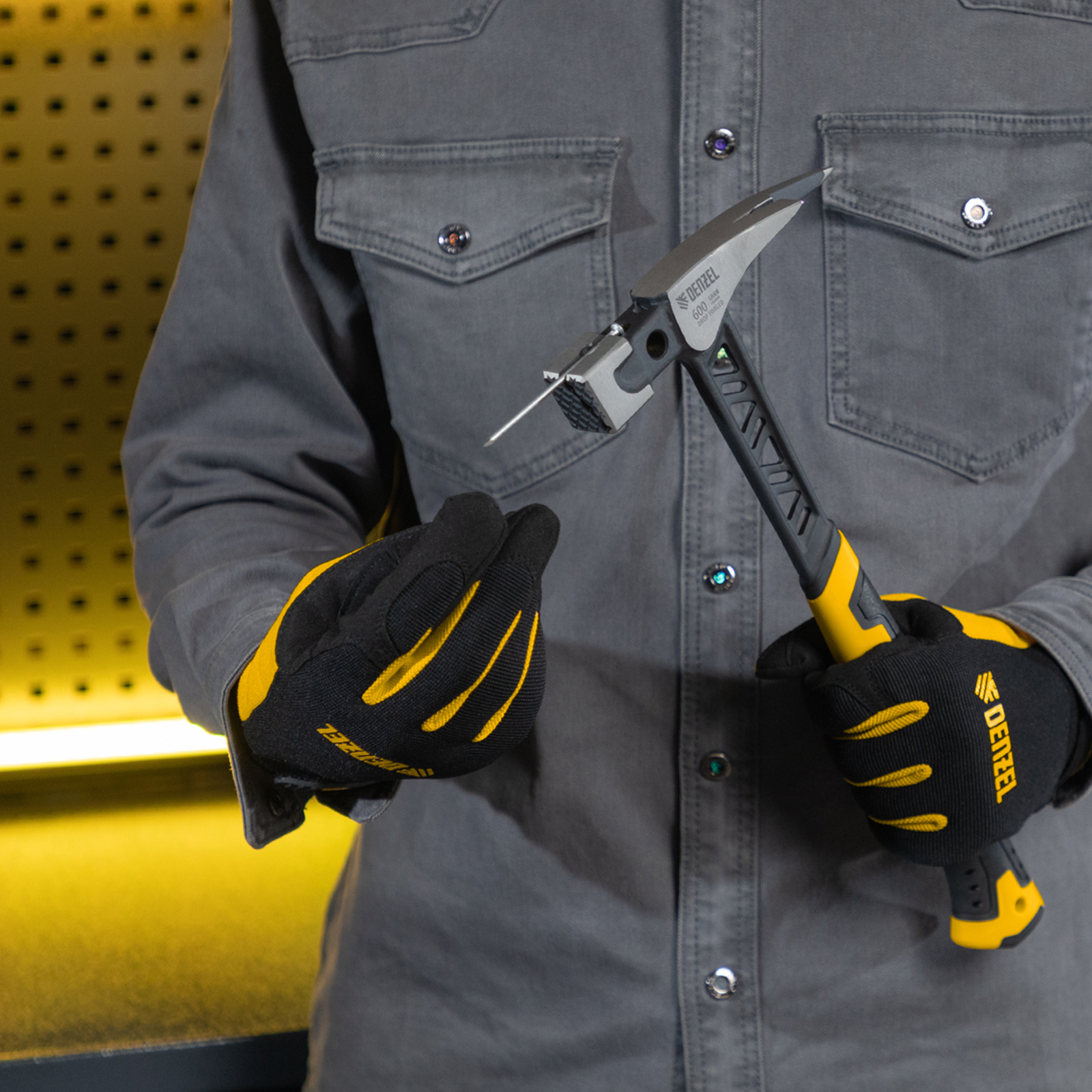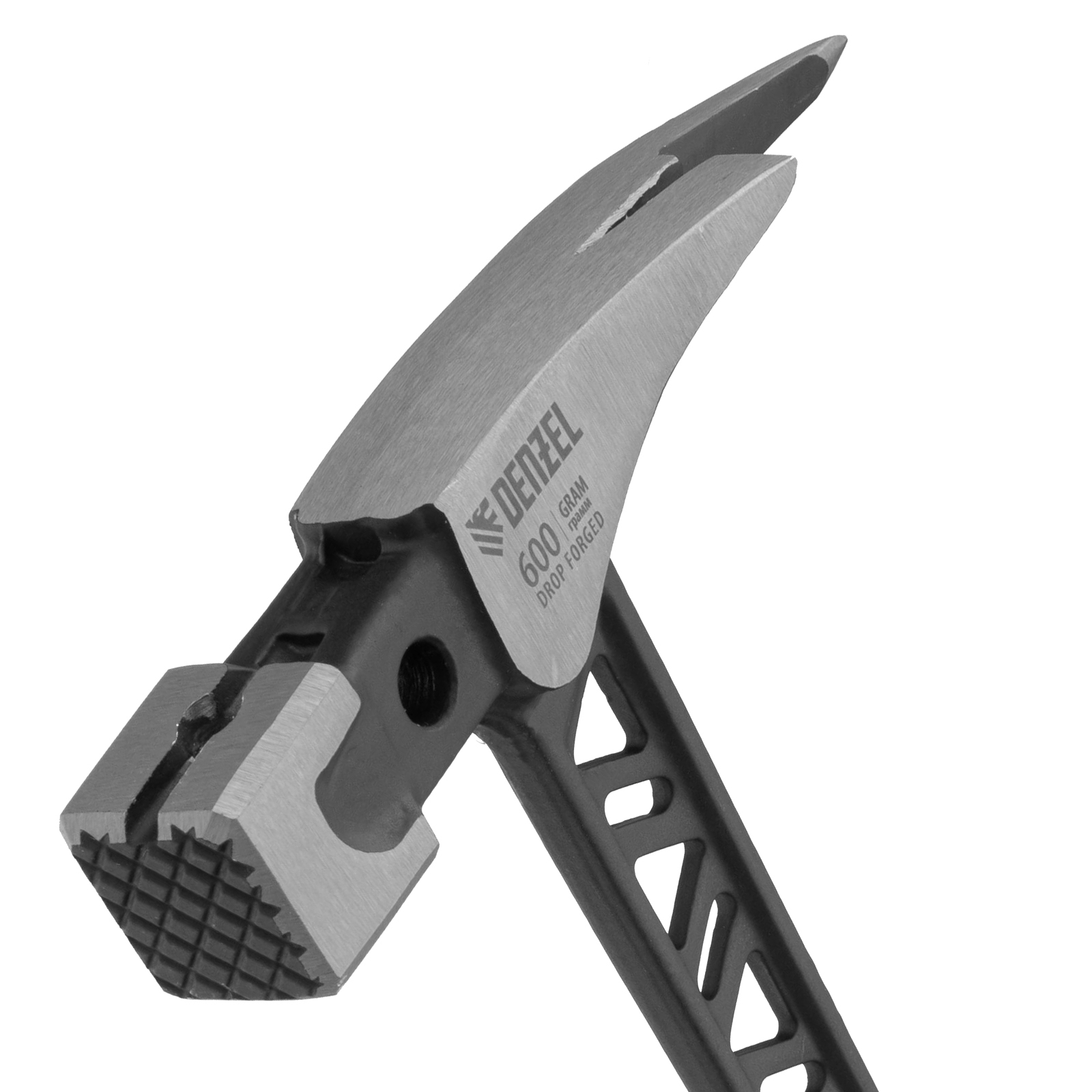 Цельнокованый молоток кровельщика Denzel 10623 с бойком весом 600 г, с магнитом и двухкомпонентной обрезиненной рукояткой, предназначен для проведения профессиональных кровельных работ. Благодаря особой конструкции позволяет проводить такие виды работ, как: выпрямление и извлечений гвоздей, пробивание отверстий в листовом металле, отгибание кромок. На рабочей поверхности бойка сделаны насечки для уменьшения риска соскальзывания при нанесении ударов по гвоздю.