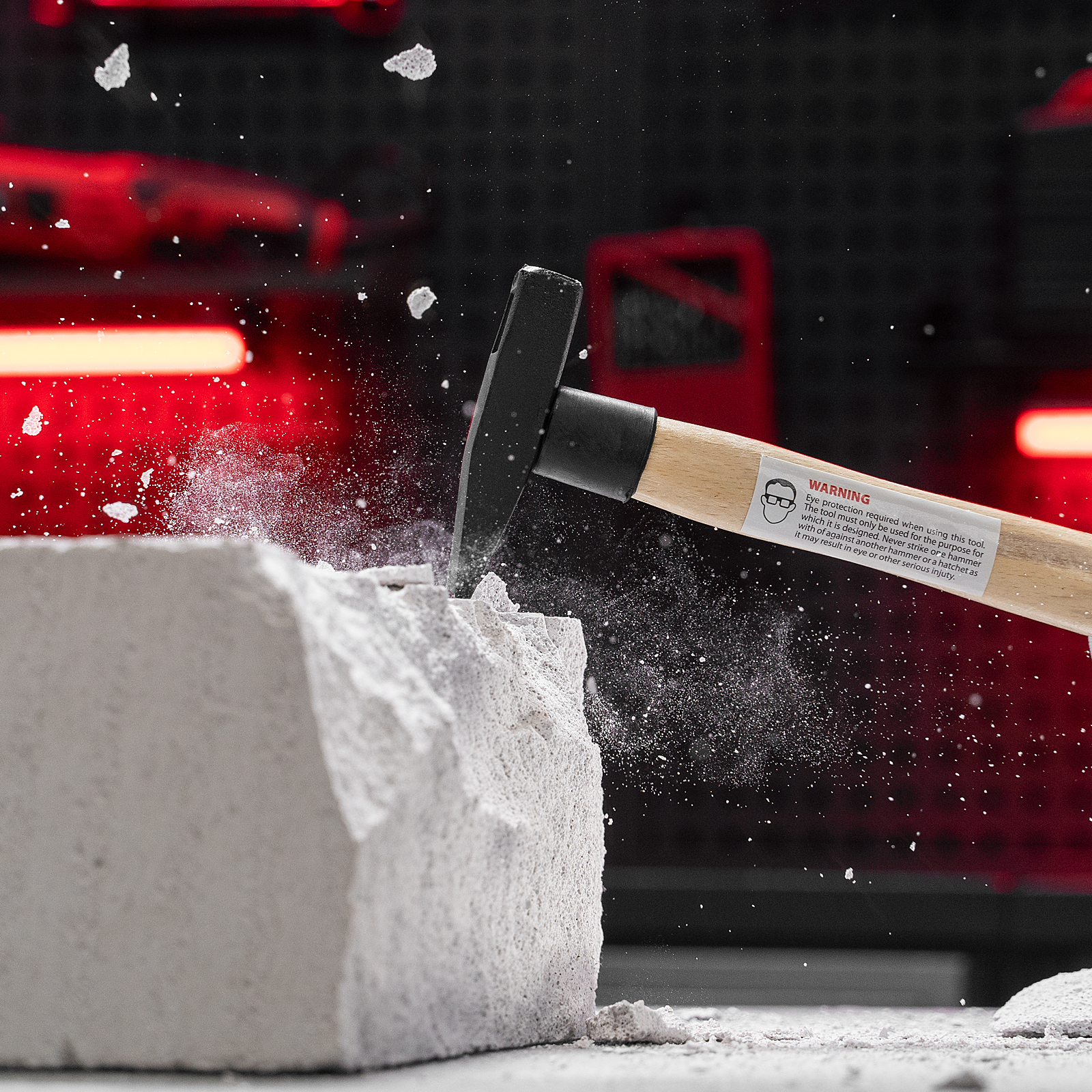 - Надежная конструкция — рукоятка расклинена, головка дополнительно зафиксирована эпоксидным клеем, увеличенная «юбка» в месте всада защищает рукоятку в случае промаха при ударе.