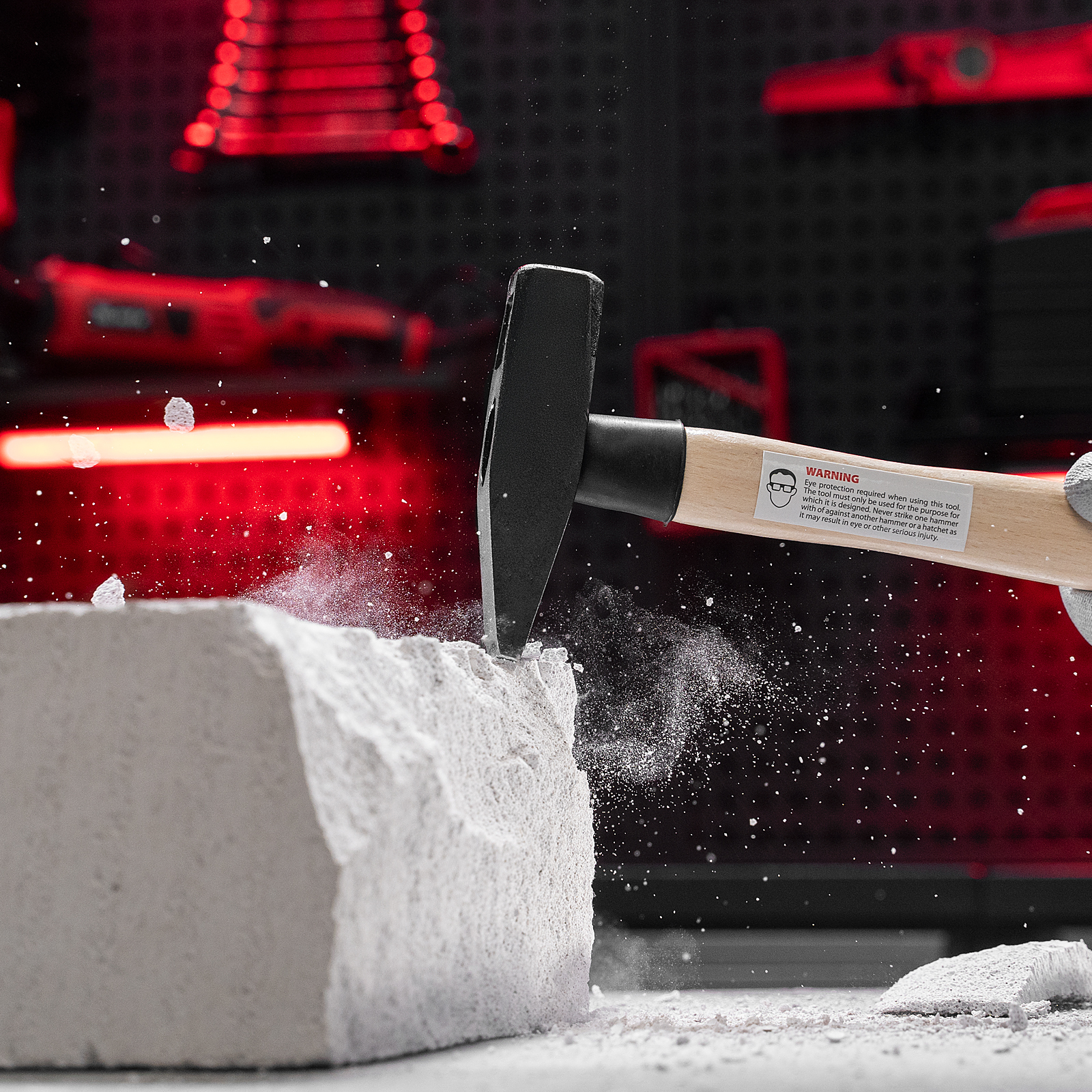 - Надежная конструкция — рукоятка расклинена, головка дополнительно зафиксирована эпоксидным клеем, увеличенная «юбка» в месте всада защищает рукоятку в случае промаха при ударе.