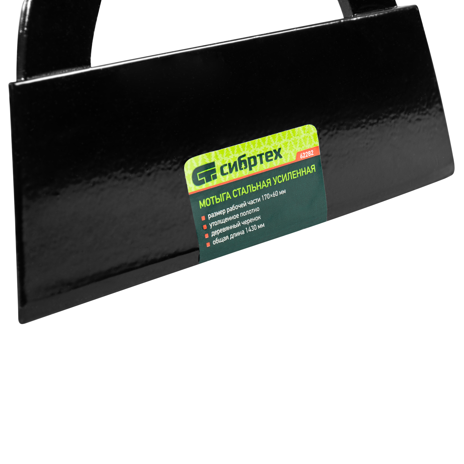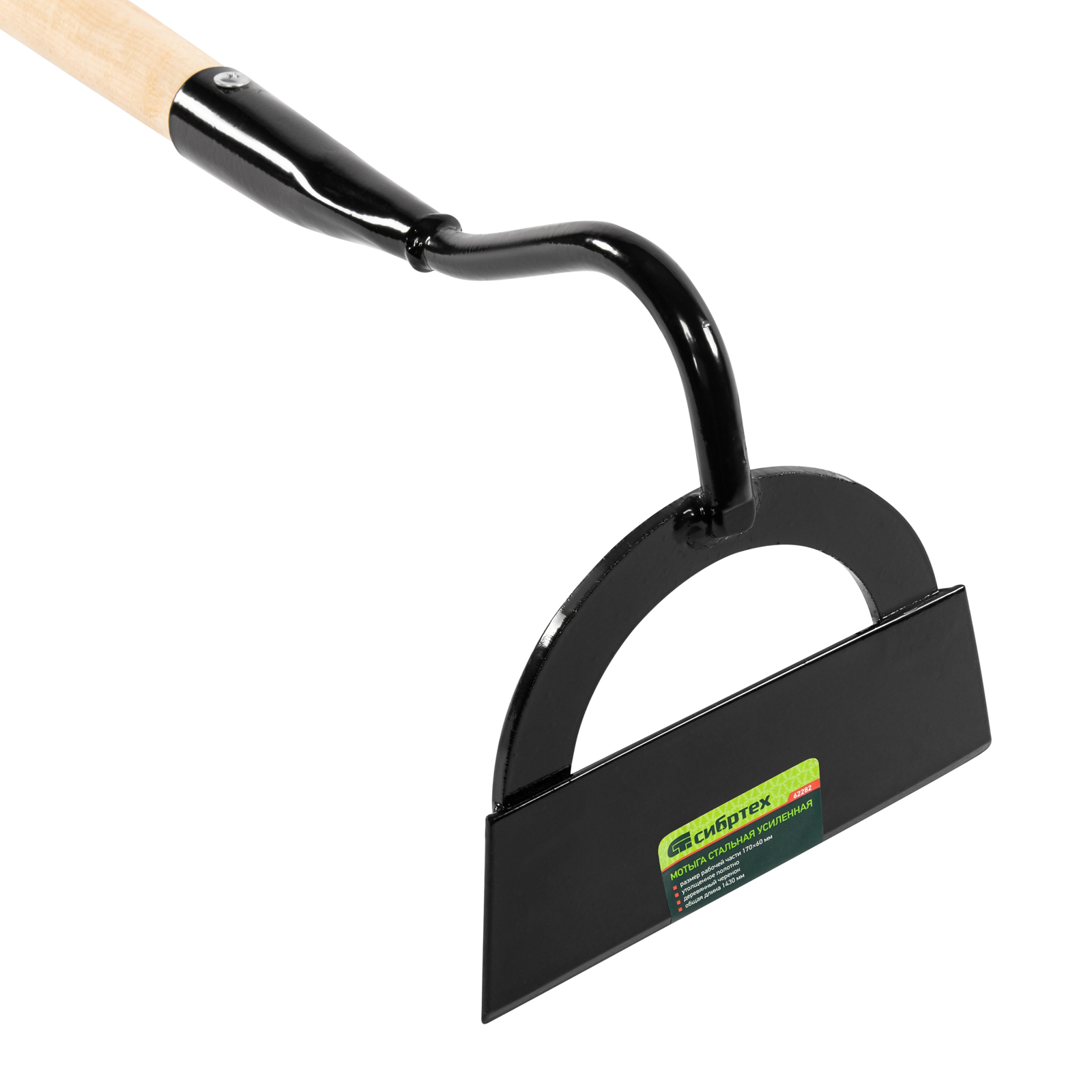 Стальная усиленная мотыга Сибртех 62282 размером 170 х 60 х 1430 мм, с деревянным черенком, — ручной инструмент для рыхления и прополки почвы, окучивания растений. Поставляется в сборе со шлифованным черенком из древесины твердых пород, обеспечивающим комфорт во время работы. Инструмент будет полезен владельцам дачных участков.