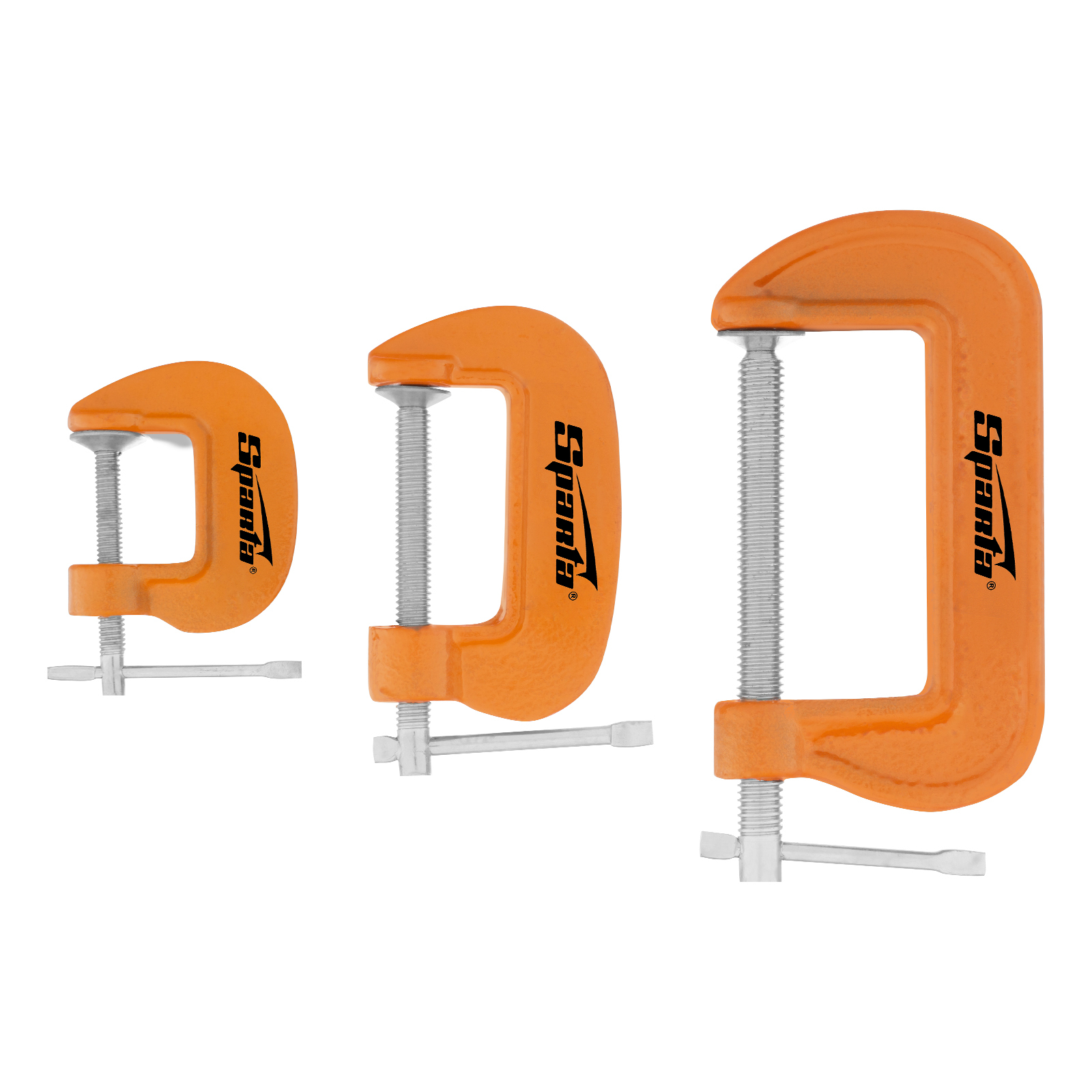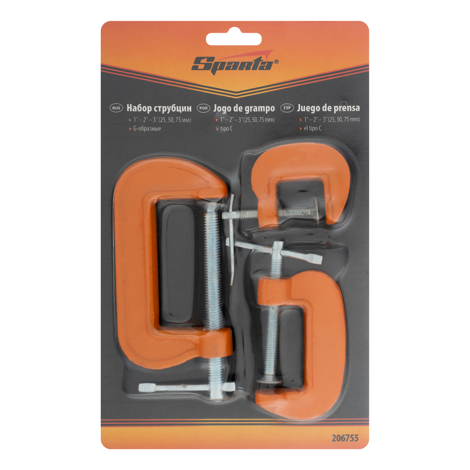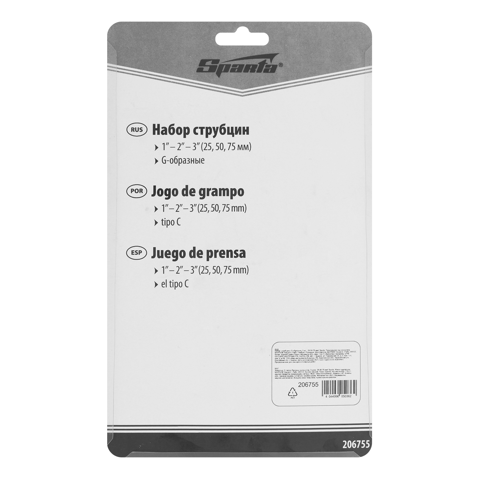 Набор Sparta 206755 включает 3 G-образные струбцины с шириной зажима 25, 50 и 75 мм. Они надежно фиксируют различные детали для дальнейшего склеивания, сверления, пиления, шлифования или сварки. Винты с воротком и крупной червячной резьбой позволяют зажимать детали плавно и со значительным усилием. Струбцины будут полезны домашнему мастеру.