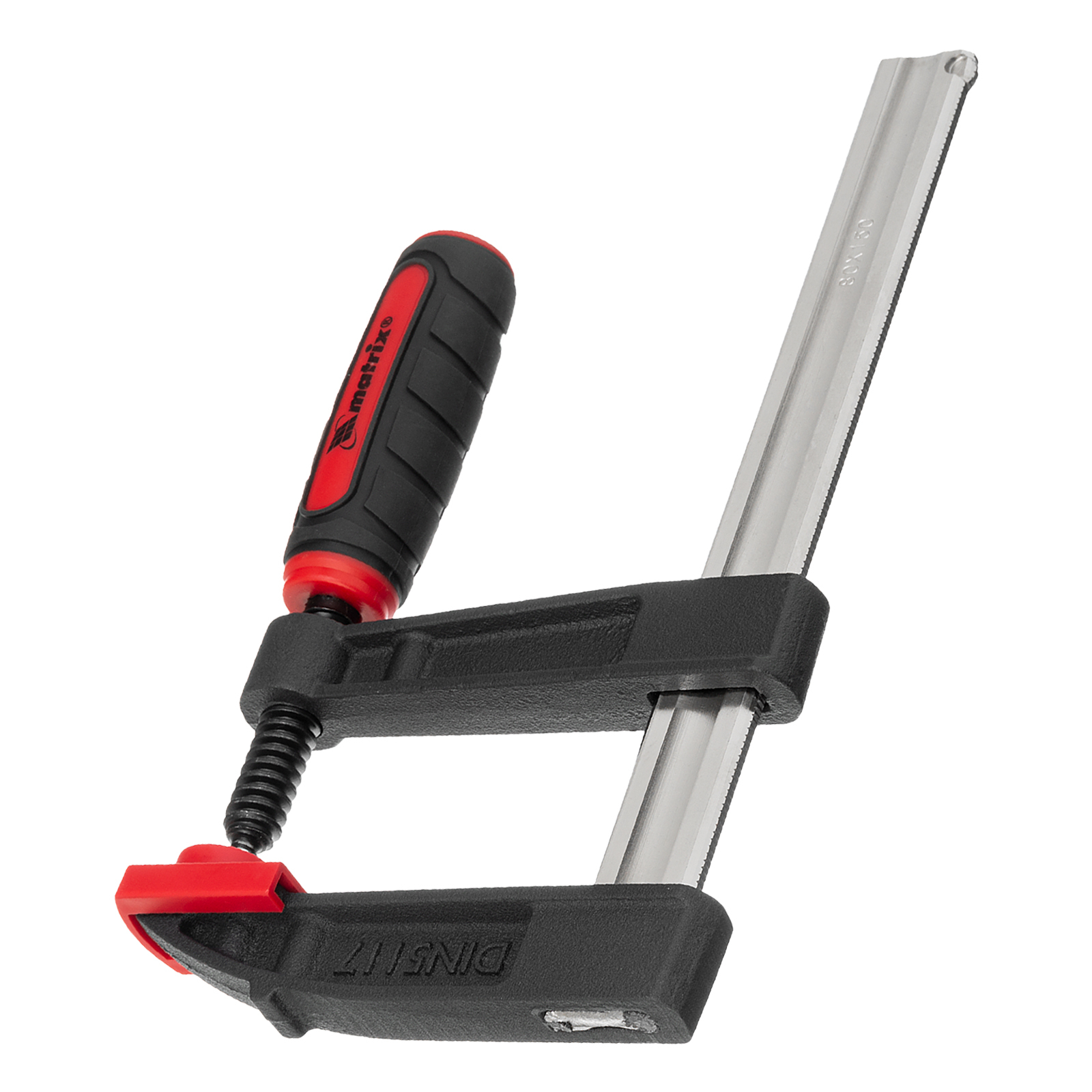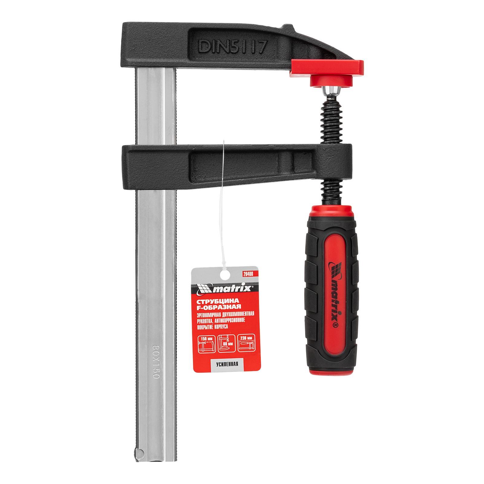 Усиленная F-образная струбцина Matrix 20400 размером 150 х 80 х 230 мм используется для зажима металлических, деревянных и других заготовок для их последующей обработки или сборки. Представляет собой штангу, на которой установлены 2 кронштейна — неподвижный и подвижный. Деталь помещается между ними и прижимается к губкам при помощи винтового зажима с трапециевидной резьбой. Величина захвата регулируется при помощи подвижного кронштейна и может достигать 150 мм. Струбцину используют для проведения слесарных и столярных работ. Металлическая конструкция выдерживает высокую температуру, поэтому инструмент пригодится для выполнения сварочных работ (перед началом необходимо снять пластиковые накладки с губок).
