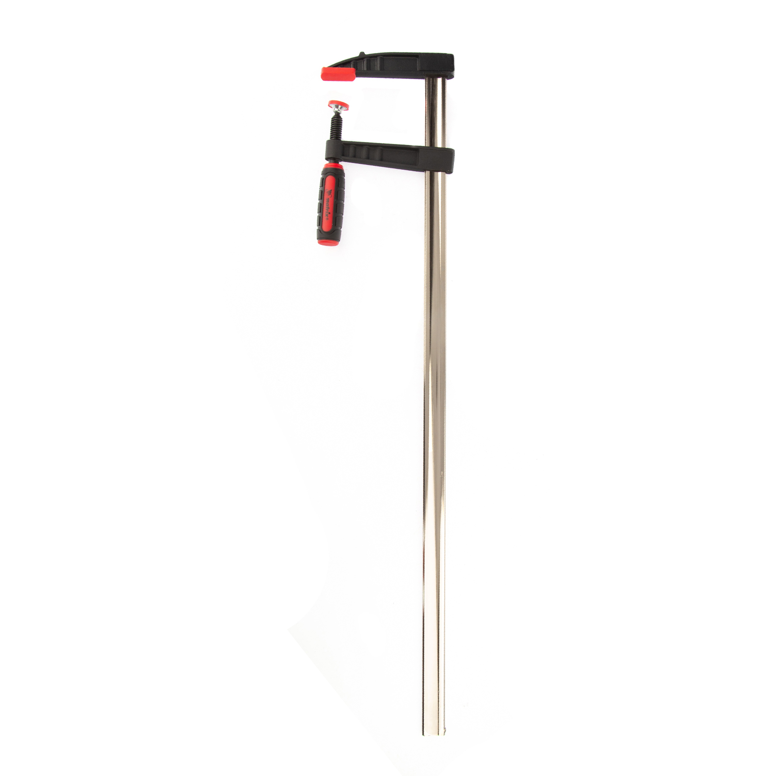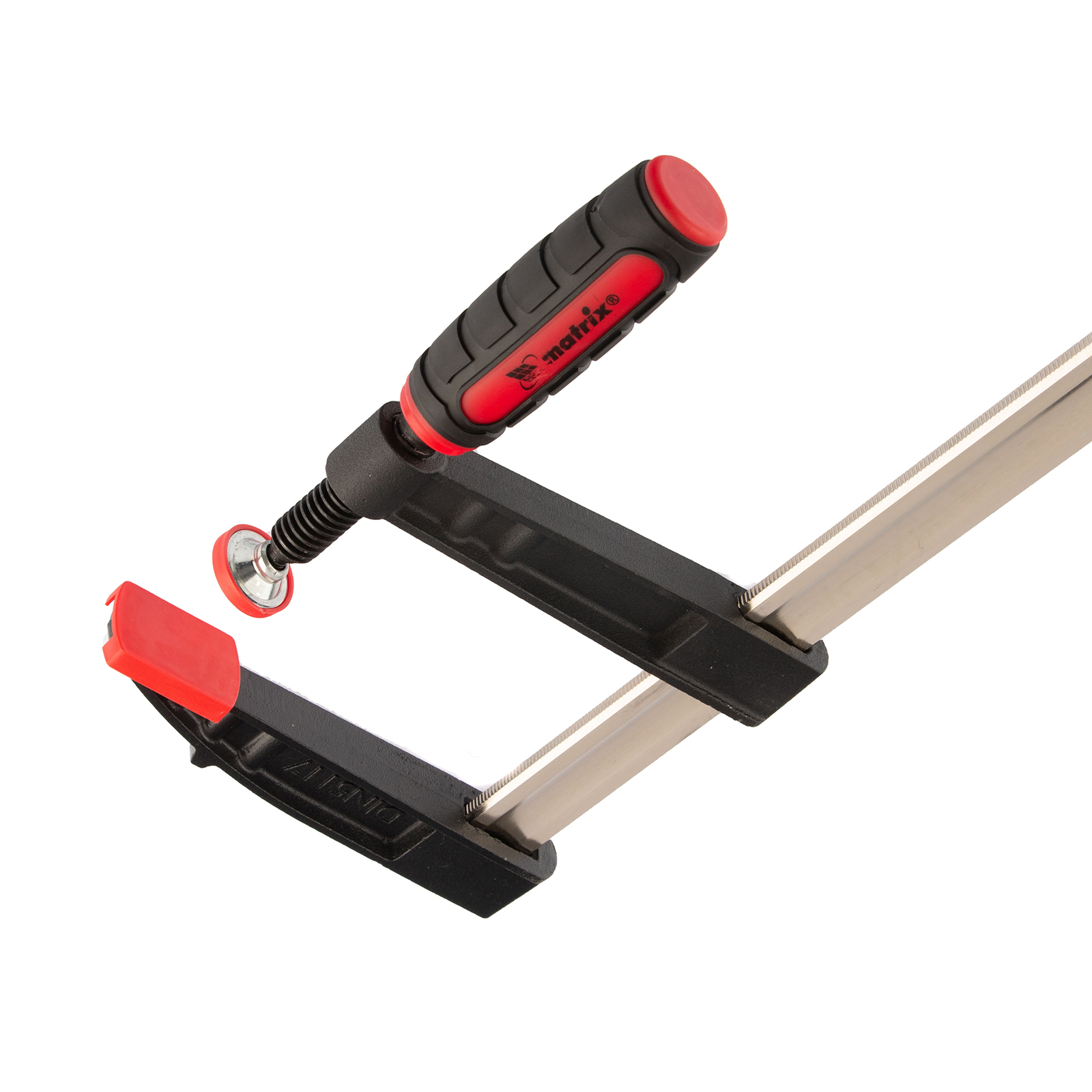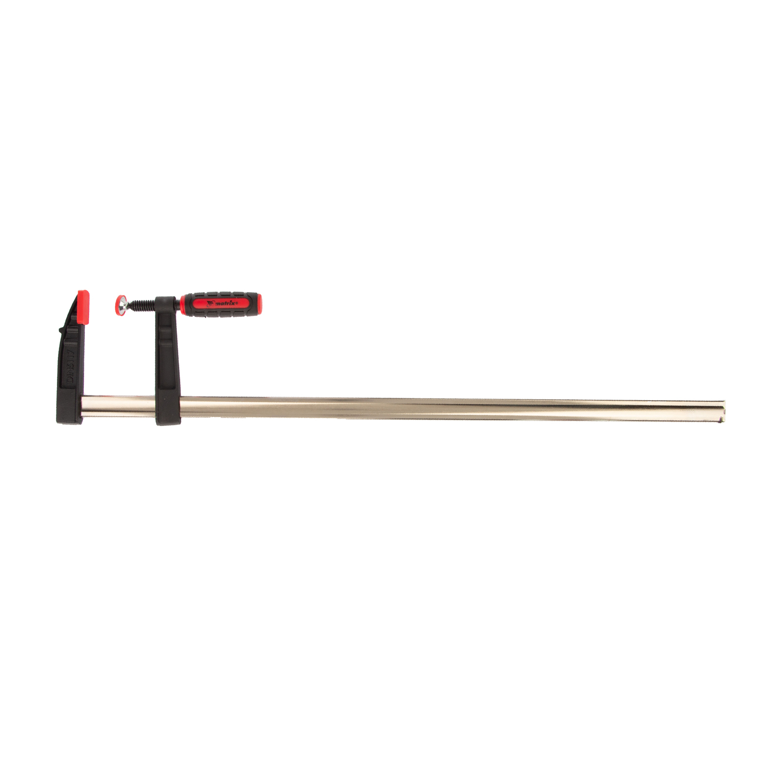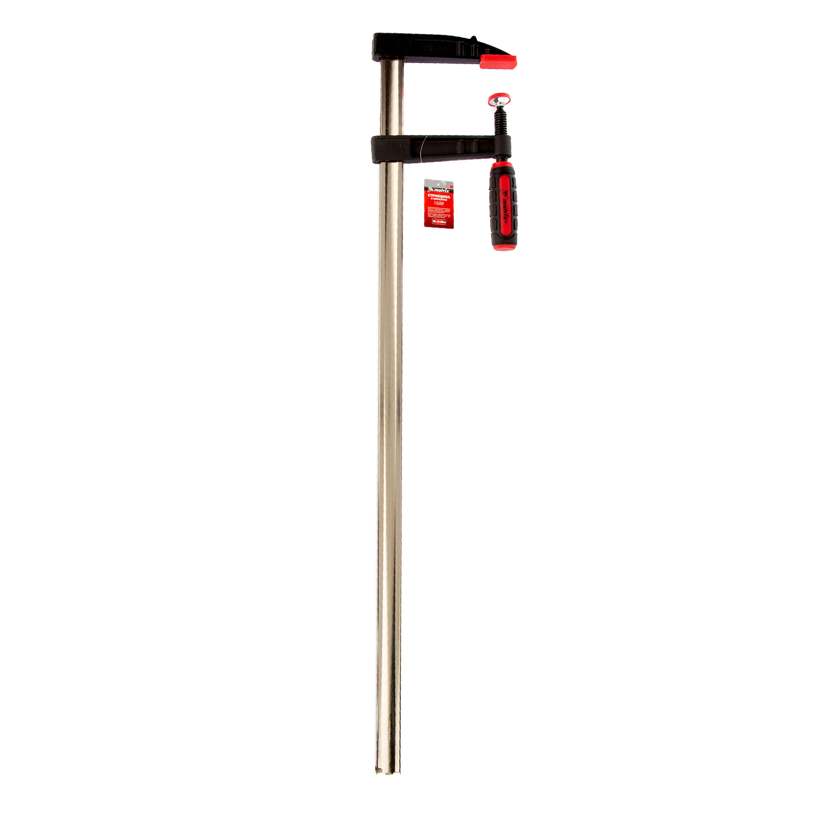 F-образная струбцина Matrix 20408 размером 800 х 120 х 900 мм используется для зажима металлических, деревянных и других заготовок для их последующей обработки или сборки. Представляет собой штангу, на которой установлено 2 кронштейна — неподвижный и подвижный. Деталь помещается между ними и прижимается к губкам при помощи винтового зажима с трапециевидной резьбой. Подвижный кронштейн позволяет регулировать величину захвата, которая может достигать 800 мм. Струбцину применяют для выполнения слесарных и столярных работ.