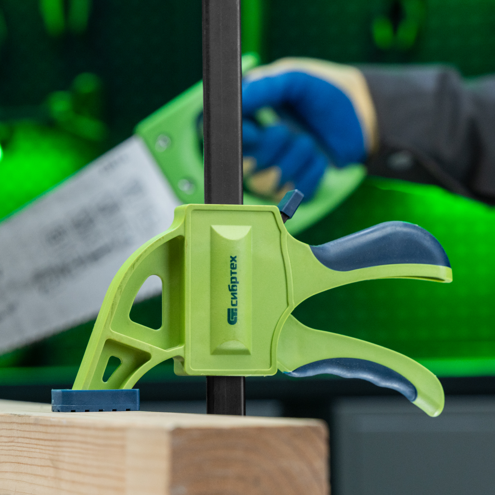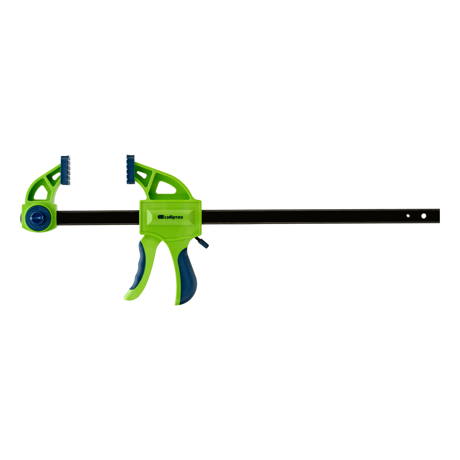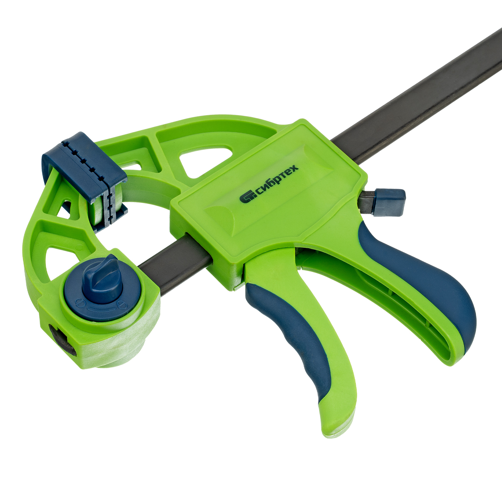 F-образная быстрозажимная струбцина Сибртех 20565 длиной 540 мм, с шириной и глубиной зажима 300 и 70 мм соответственно, в пластиковом корпусе, с фиксатором и двухкомпонентной рукояткой, позволяет зажимать заготовки для их дальнейшей обработки или сборки. Помогает решать множество задач благодаря оптимальной глубине зажима. Пластинчатый механизм пошагово перемещает подвижную губку вдоль направляющей до достижения максимально плотного захвата детали. Фиксатор препятствует движению губки в обратную сторону. Струбцина пригодится в столярной мастерской, а также будет полезна в быту.