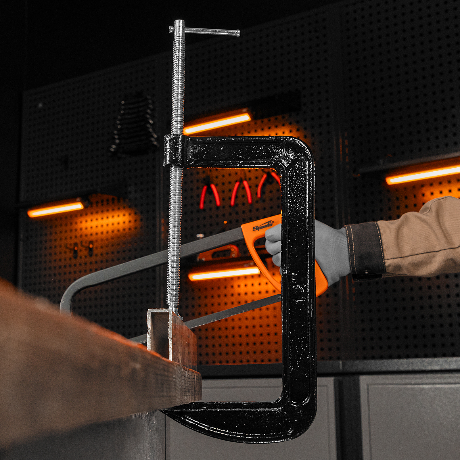 G-образная струбцина Sparta 206715 с шириной зажима 300 мм надежно фиксирует различные детали для дальнейшего склеивания, сверления, пиления, шлифования или сварки. Винт с воротком и крупной червячной резьбой позволяет зажимать детали плавно и со значительным усилием. Струбцина будет полезна домашнему мастеру.