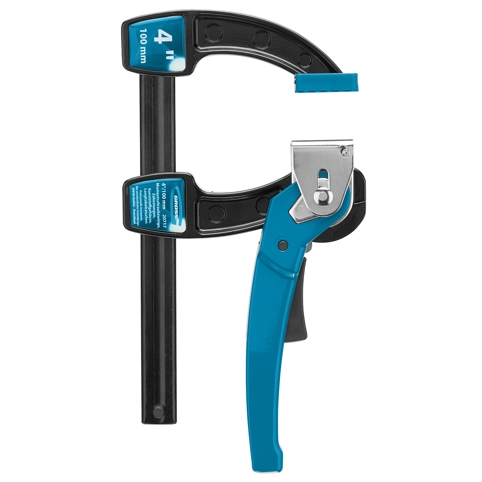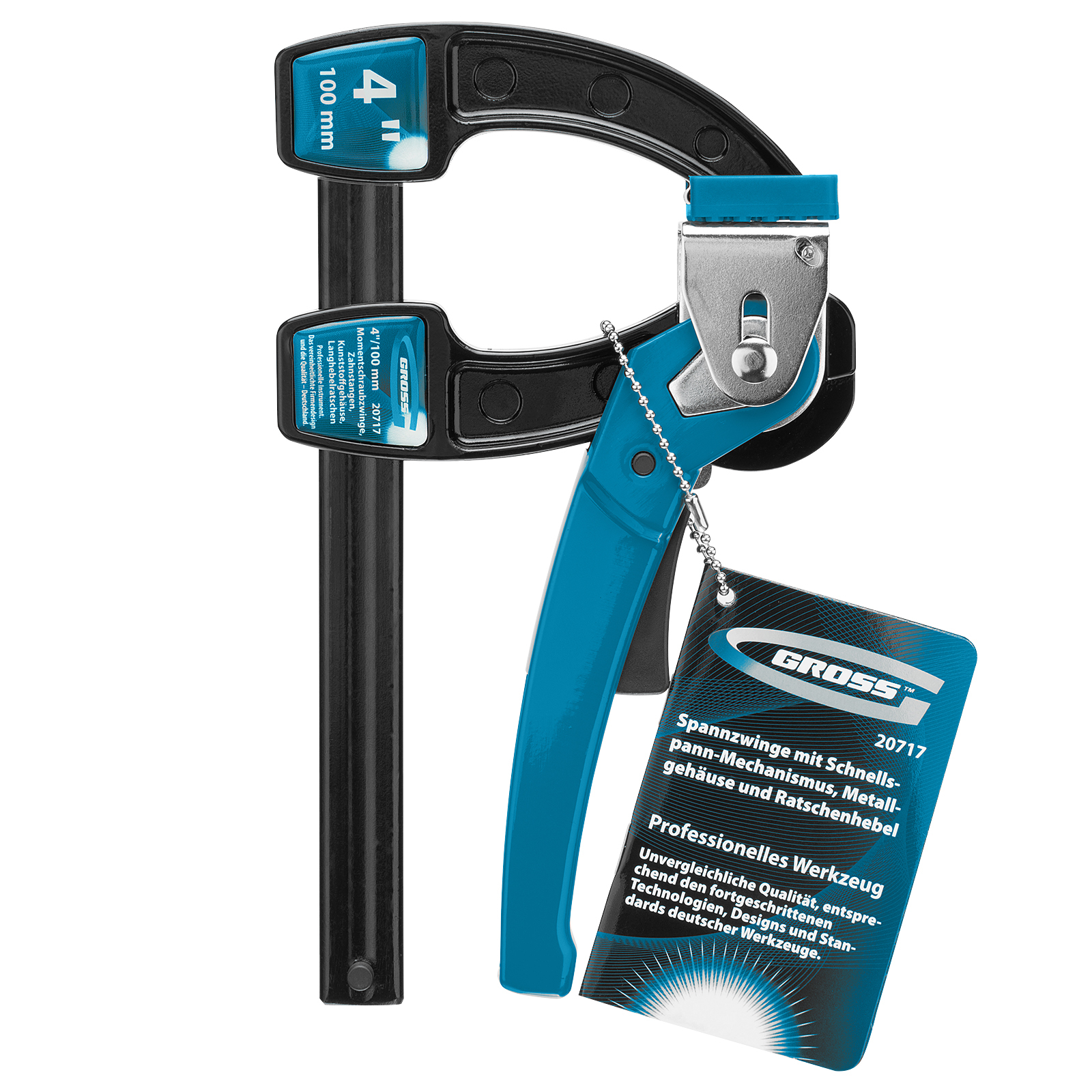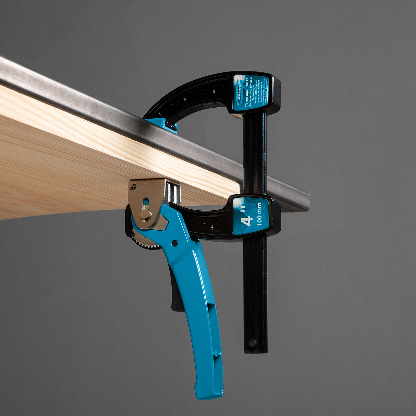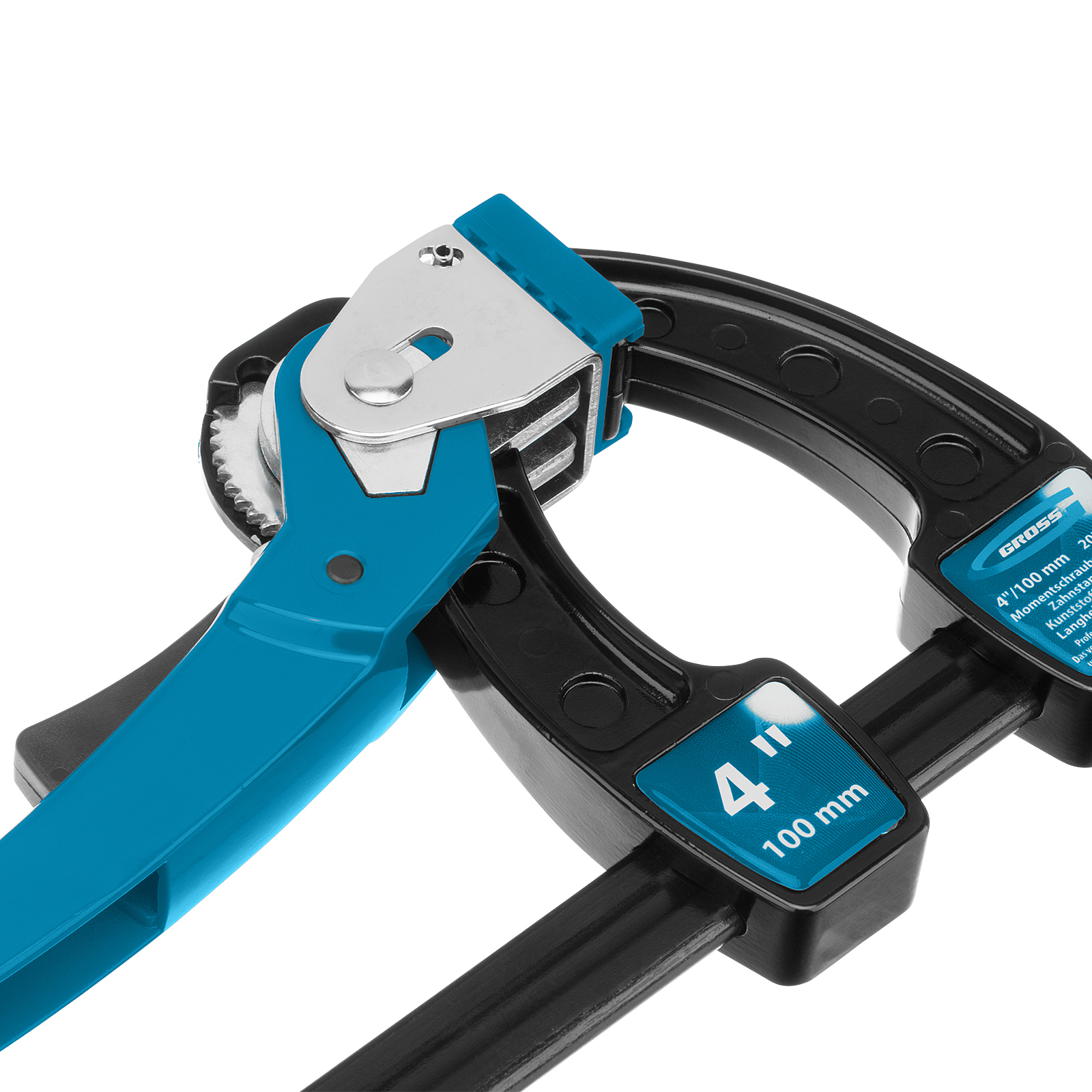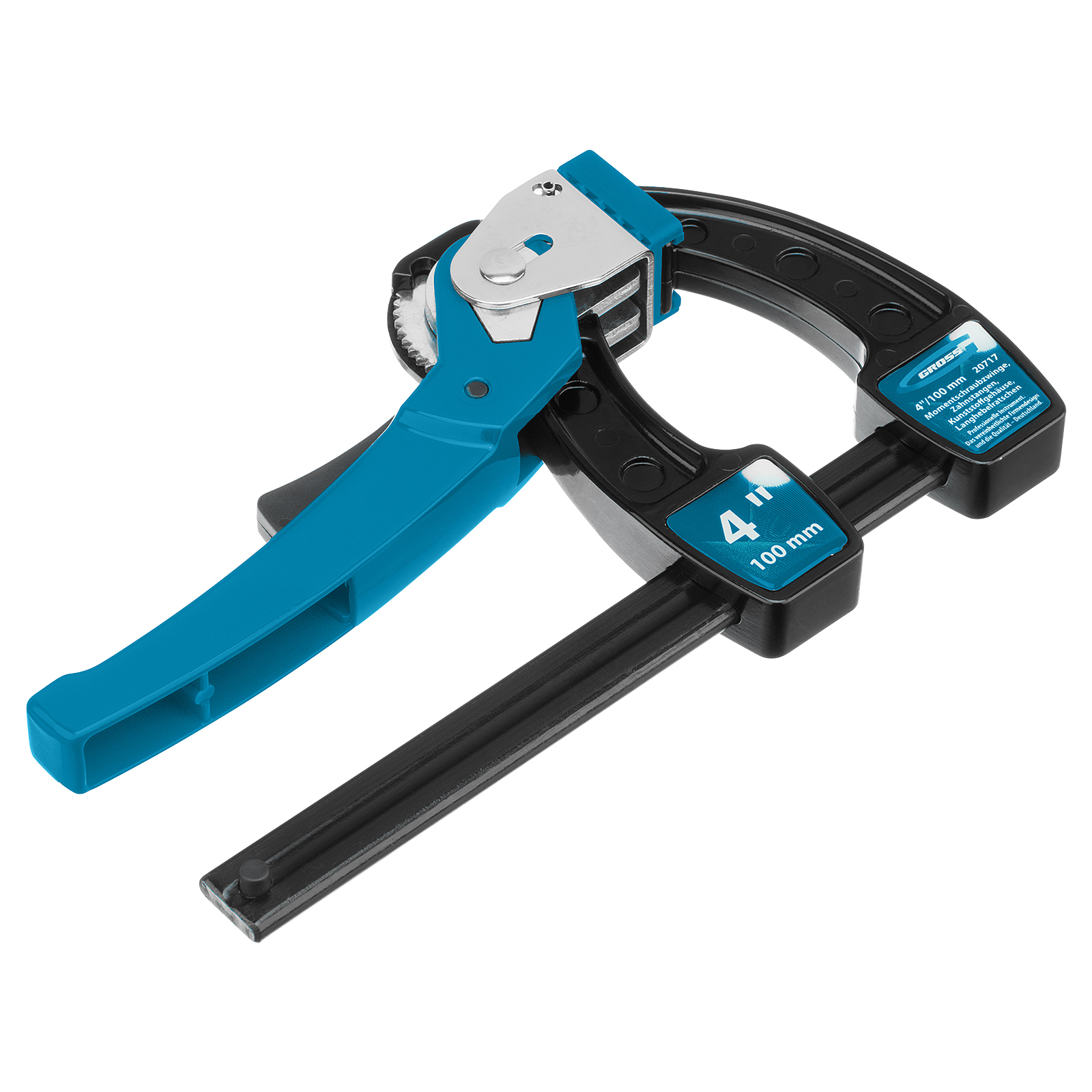 Реечная быстрозажимная струбцина Gross 20717, с металлическим корпусом, с рычажным храповым механизмом, служит для фиксирования деталей и конструкций толщиной до 4 дюймов / 100 мм. Губки подводят вплотную к детали, а храповый механизм с рычагом позволяет произвести окончательную фиксацию, максимально используя мускульную силу. Стопорный механизм VIBRAFIX способен удерживать предметы с усилием 1200 Н. Струбцина используется для выполнения профессиональных столярных и слесарных работ.