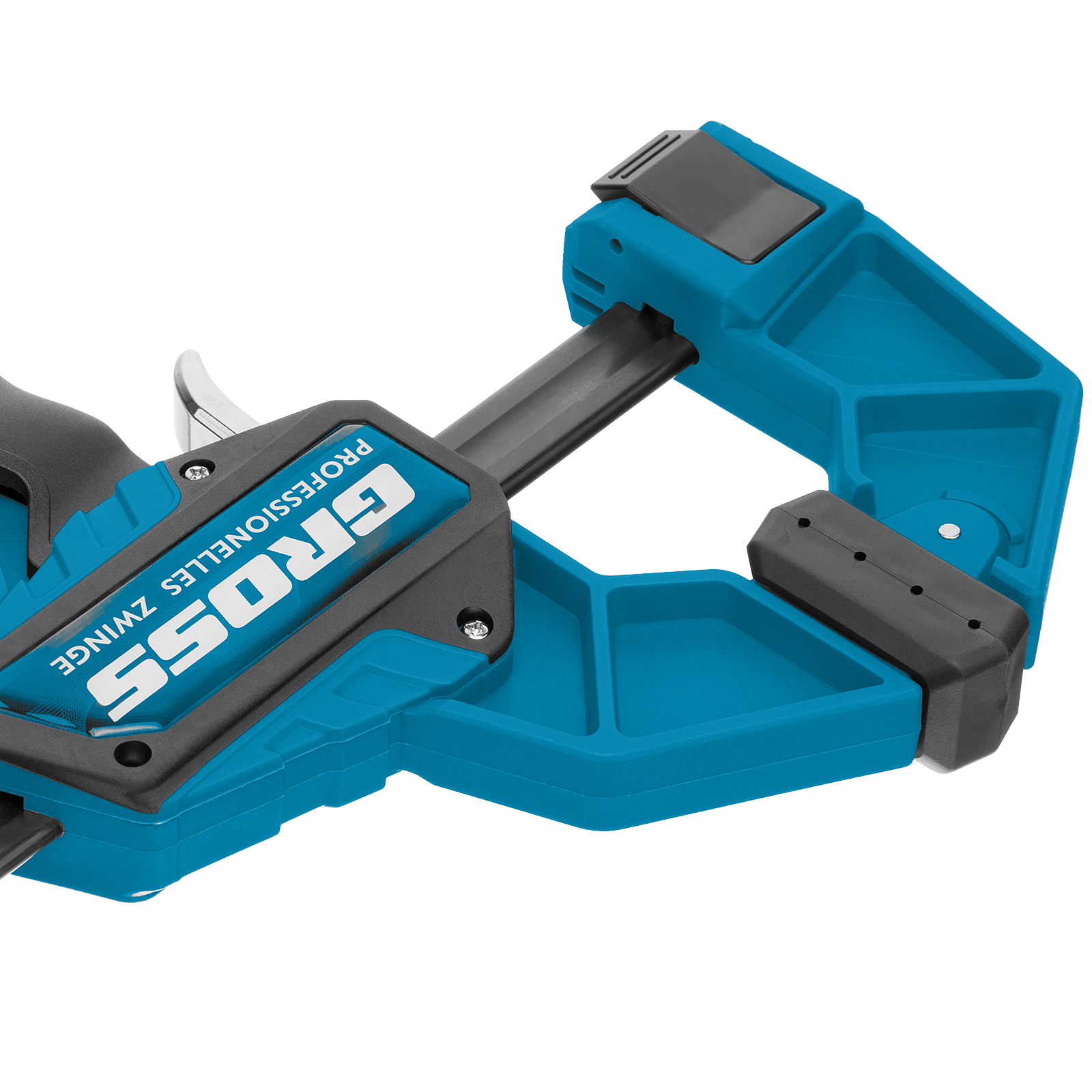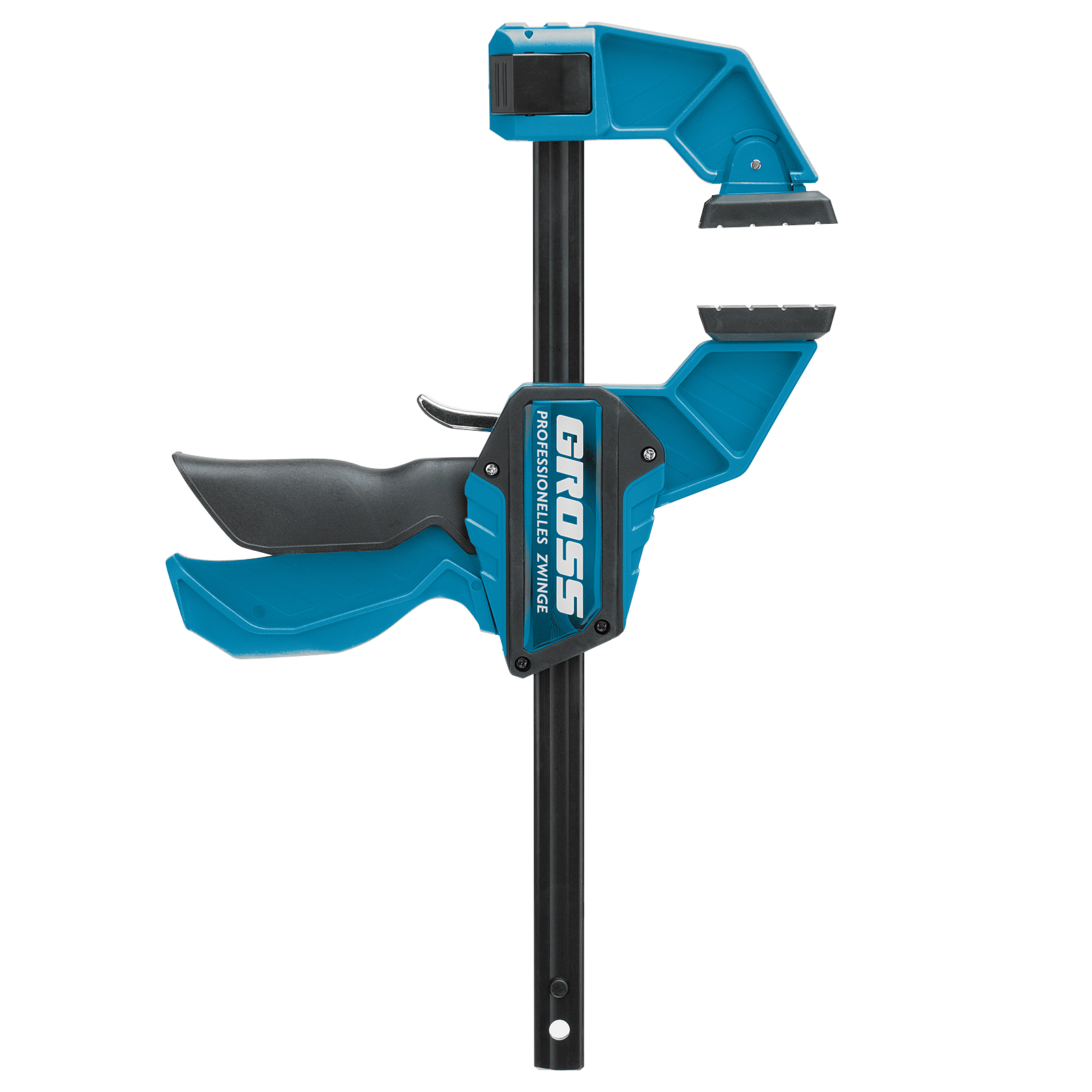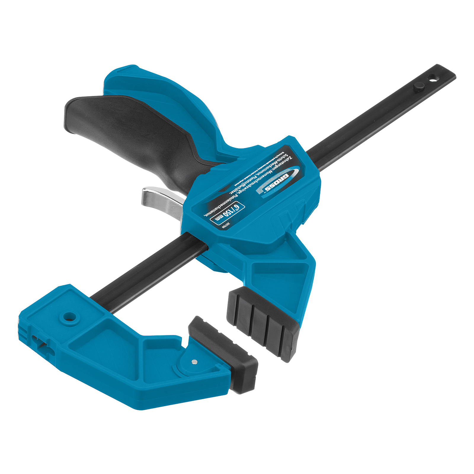 Реечная быстрозажимная струбцина Gross 20700 пистолетного типа, с пластиковым корпусом, с шириной зажима 150 мм, с пошаговым механизмом, используется для зажимания заготовок при выполнении столярных или монтажных работ. Удобна для фиксации деревянных деталей, т. к. пластиковые накладки на губках не повреждают их поверхность при сжатии. Подвижная губка пошагово перемещается по рейке, постепенно зажимая обрабатываемый предмет. Курковый фиксатор удерживает ее в заданном положении. Инструмент рекомендован для профессионального использования.