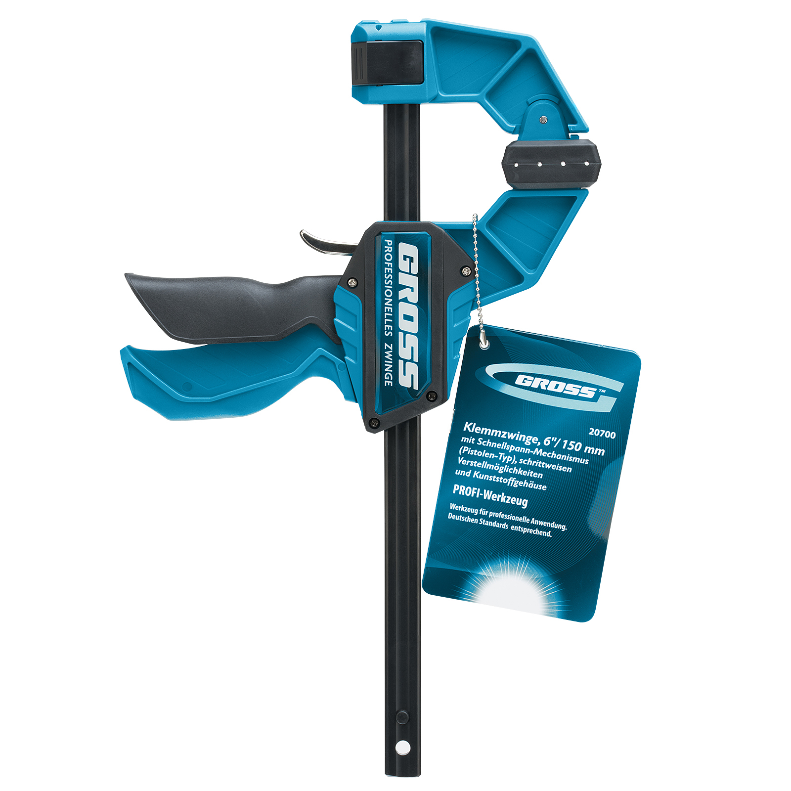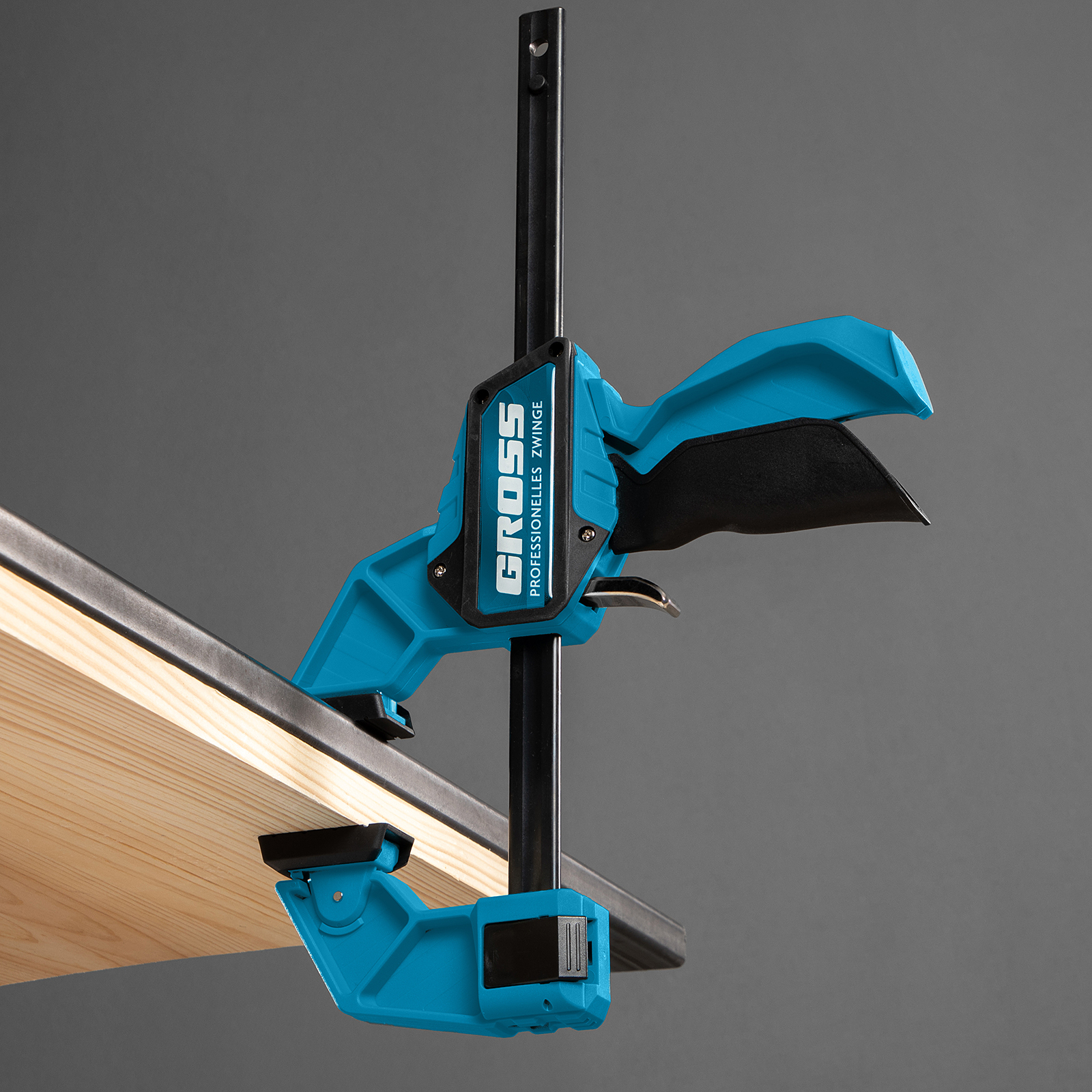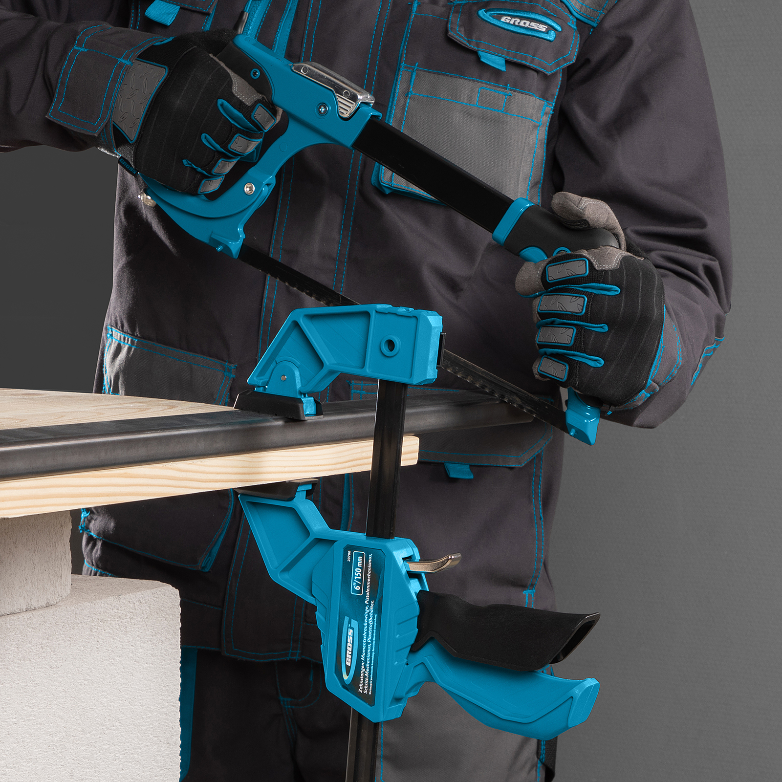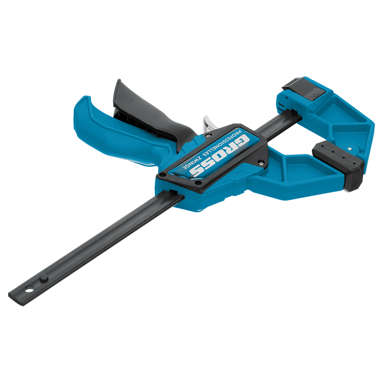Реечная быстрозажимная струбцина Gross 20700 пистолетного типа, с пластиковым корпусом, с шириной зажима 150 мм, с пошаговым механизмом, используется для зажимания заготовок при выполнении столярных или монтажных работ. Удобна для фиксации деревянных деталей, т. к. пластиковые накладки на губках не повреждают их поверхность при сжатии. Подвижная губка пошагово перемещается по рейке, постепенно зажимая обрабатываемый предмет. Курковый фиксатор удерживает ее в заданном положении. Инструмент рекомендован для профессионального использования.