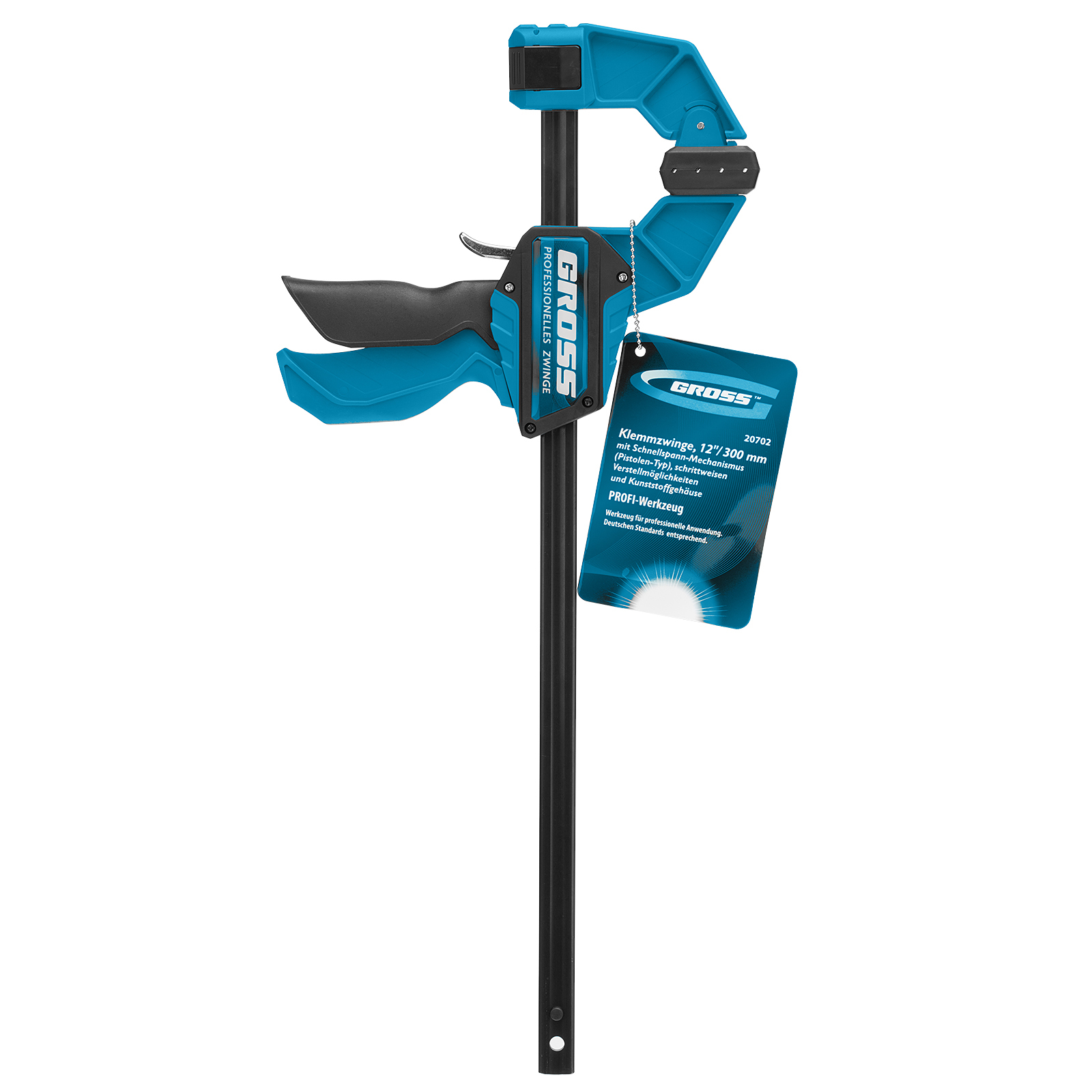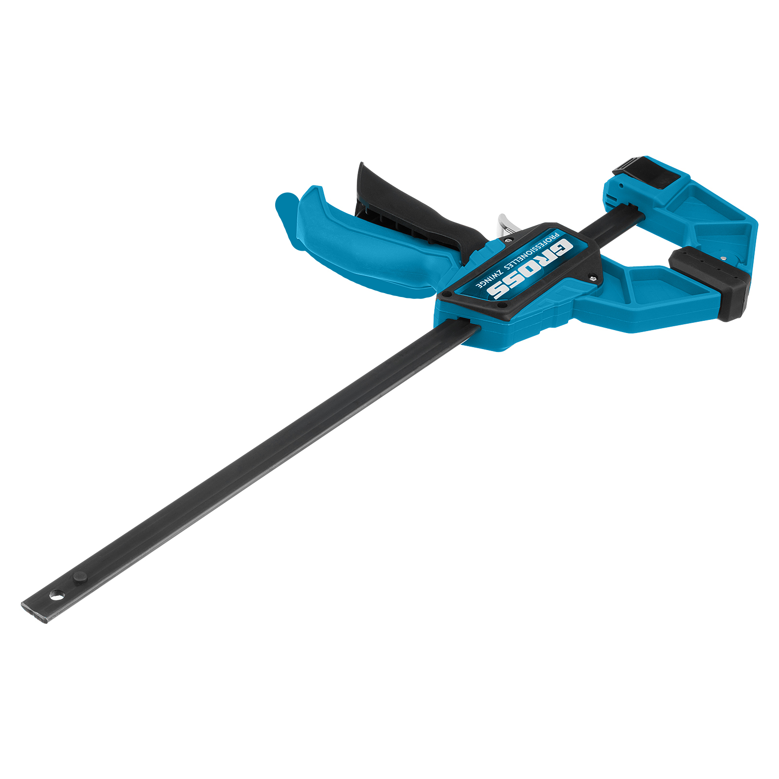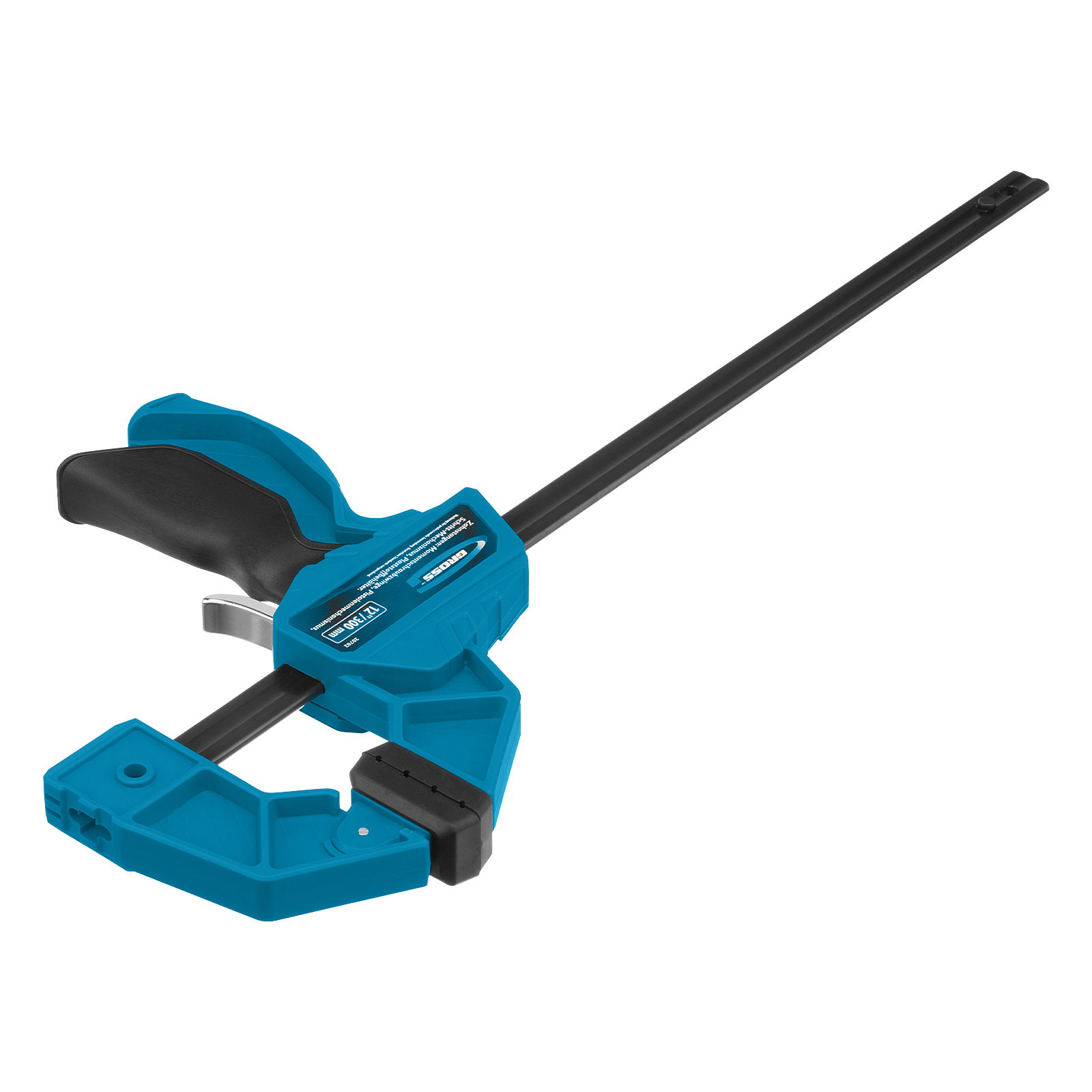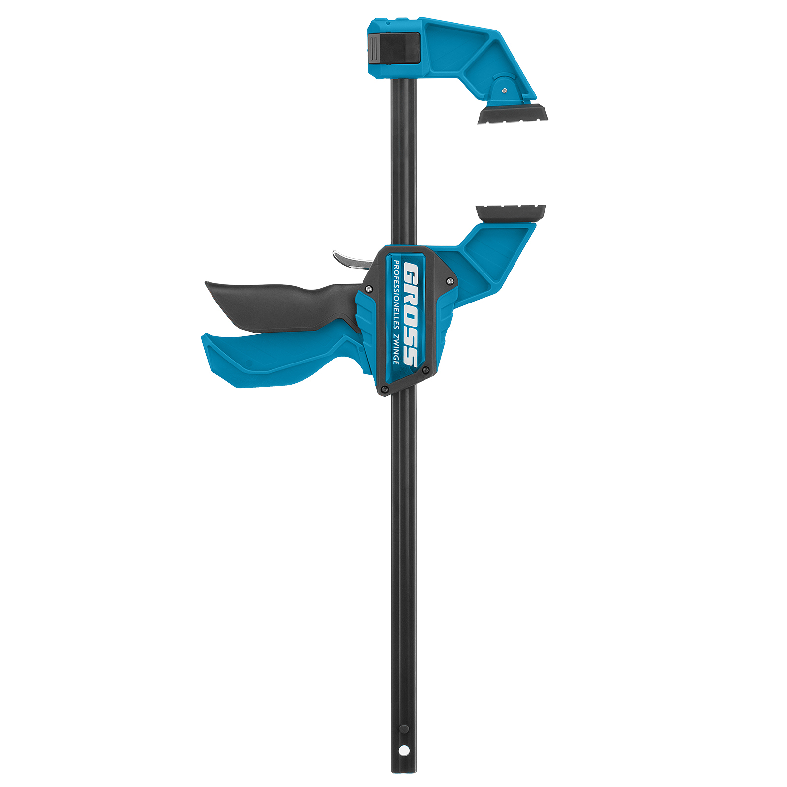 Реечная быстрозажимная струбцина Gross 20702 пистолетного типа, с пластиковым корпусом, с шириной зажима 300 мм, с пошаговым механизмом, используется для зажимания заготовок при выполнении столярных или монтажных работ. Удобна для фиксации деревянных деталей, т. к. пластиковые накладки на губках не повреждают их поверхность при сжатии. Подвижная губка пошагово перемещается по рейке, постепенно зажимая обрабатываемый предмет. Курковый фиксатор удерживает ее в заданном положении. Инструмент рекомендован для профессионального использования.
