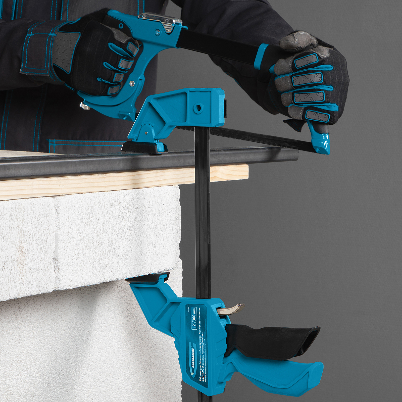 - Многофункциональность — опорную губку можно переставить на другой конец рейки, чтобы использовать струбцину как распорный инструмент.