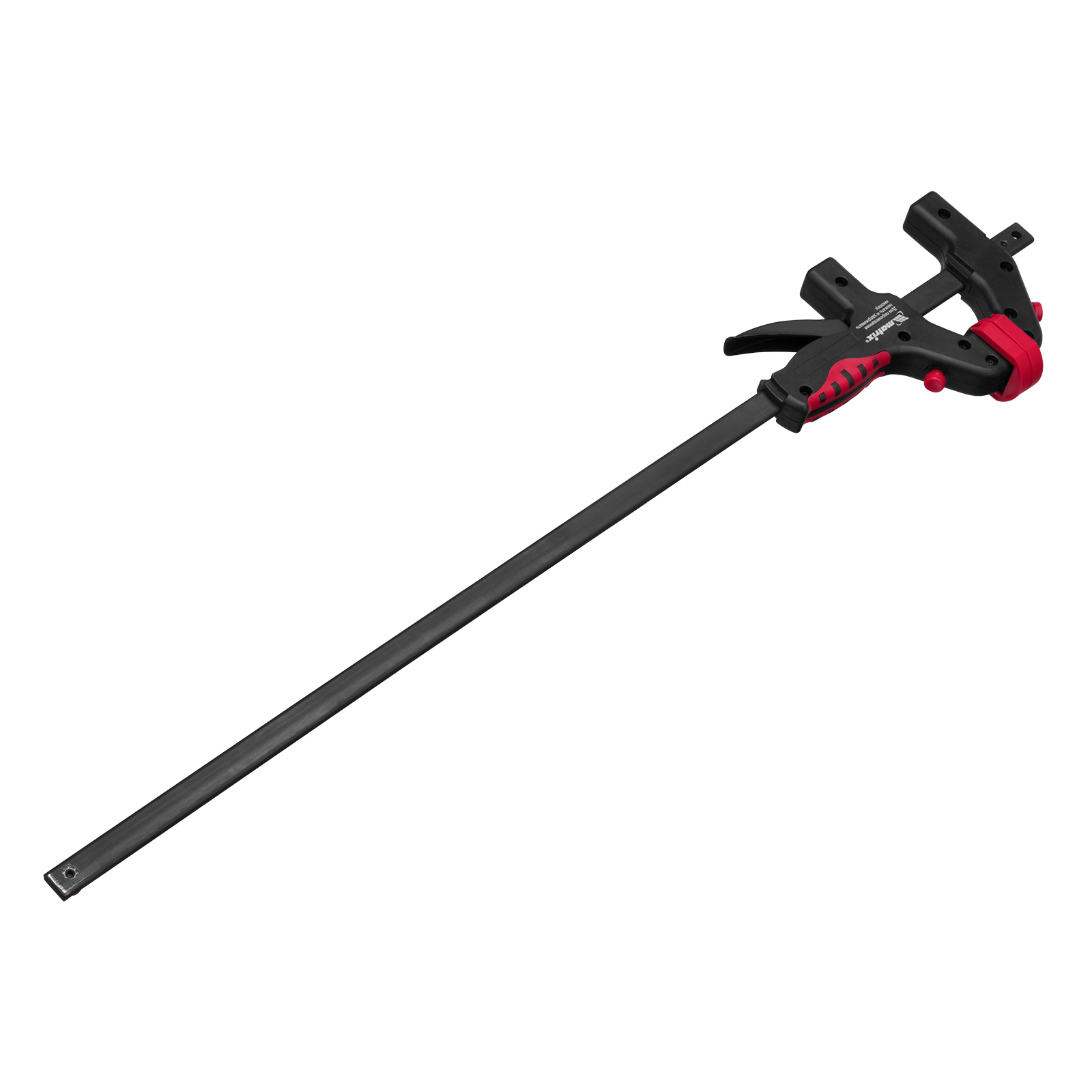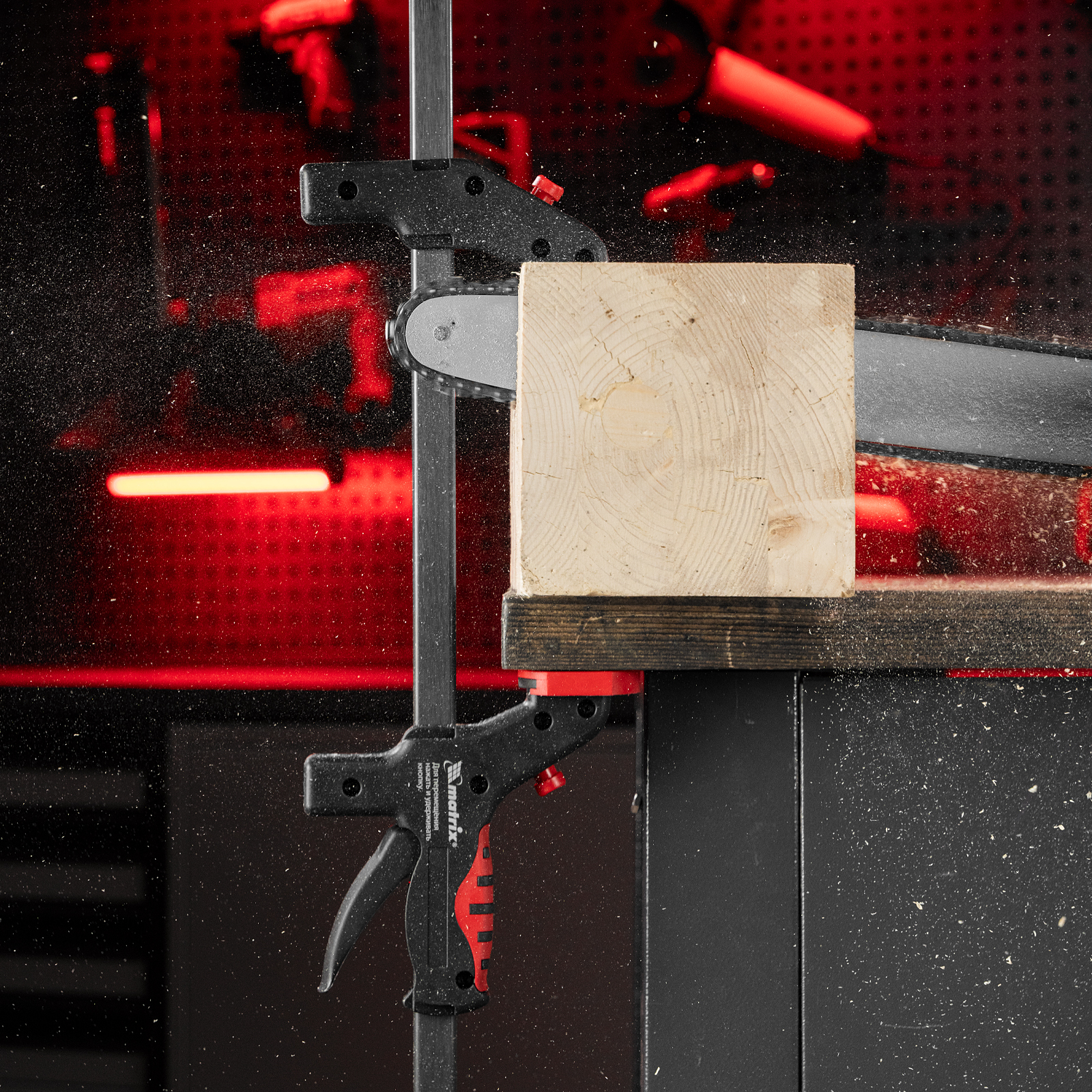 Универсальная F-образная быстрозажимная струбцина Matrix 20547 размером 760 х 1065 х 90 мм, в пластиковом корпусе, используется в столярном деле. Позволяет быстро фиксировать заготовки с целью их соединения или обработки — склеивания, сверления, шлифовки, пиления и других видов работ. Подвижная губка перемещается вдоль штанги при помощи пластинчатого механизма, а фиксатор препятствует разжиманию струбцины. Массивная конструкция обеспечивает надежность инструмента.