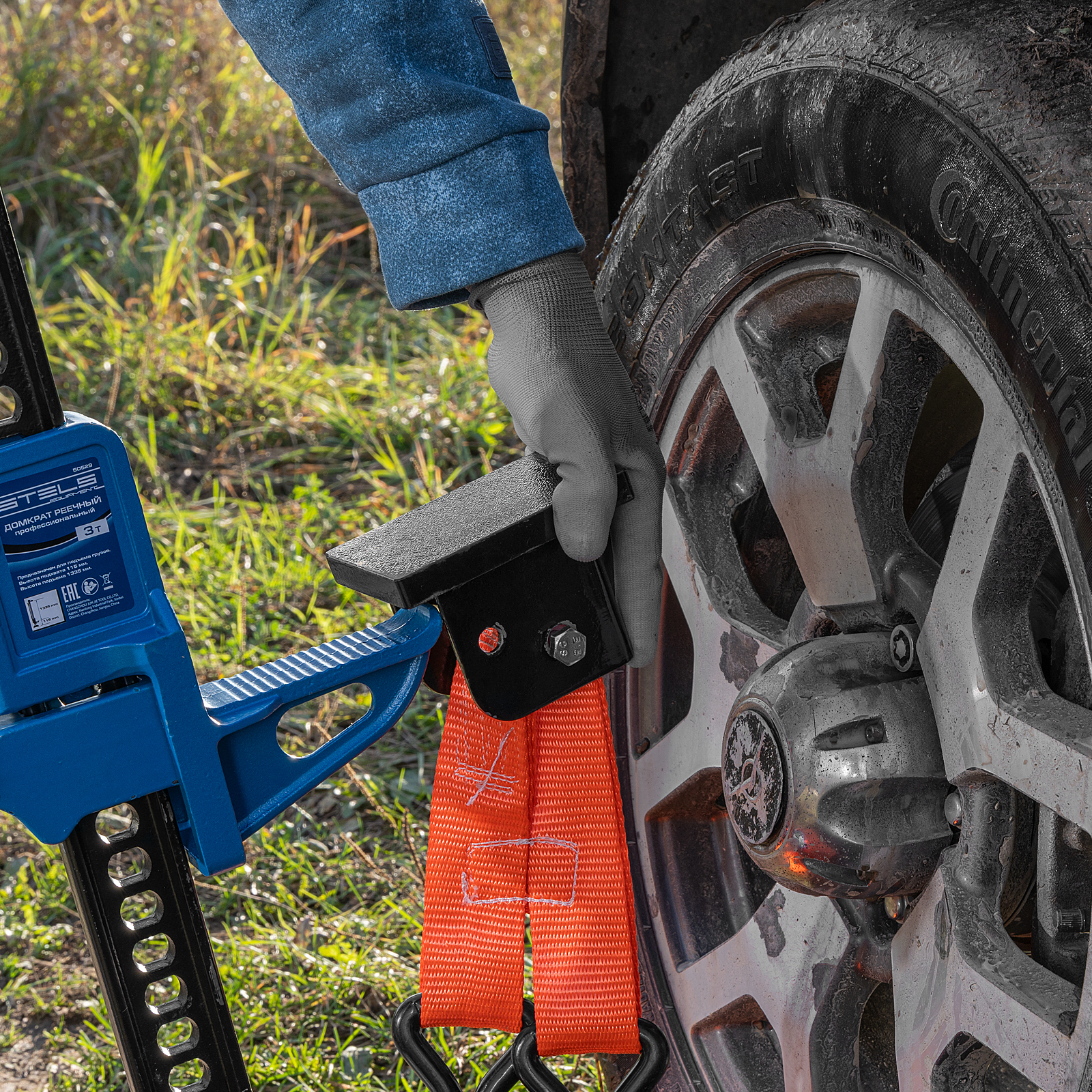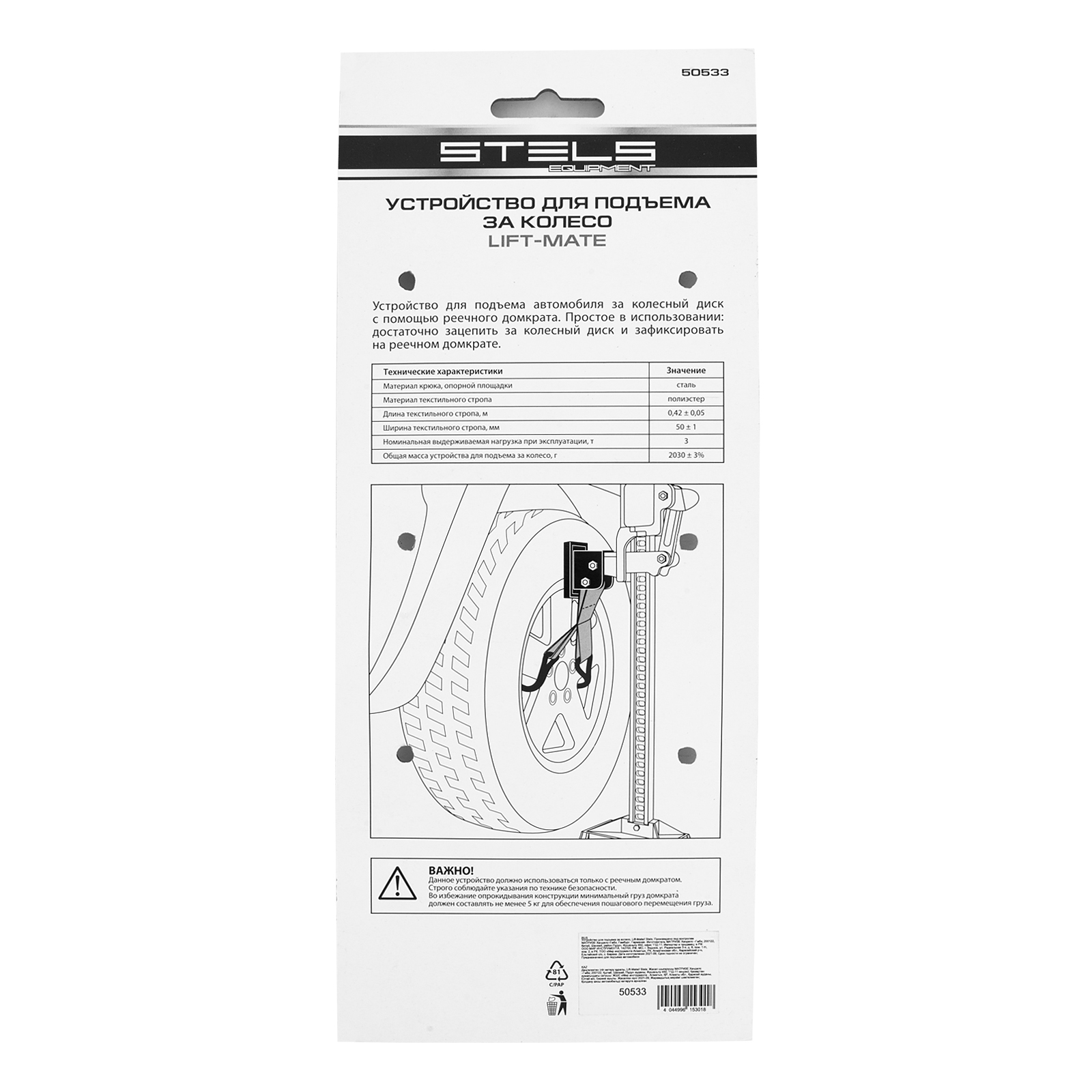 Устройство для подъема за колесо Stels Lift-Mate 50533 используется с реечным домкратом и позволяет поднять застрявший в грязи автомобиль, зацепив крюки за колесный диск. Подходит для большинства автомашин, будет полезно в поездках на дальние расстояния.